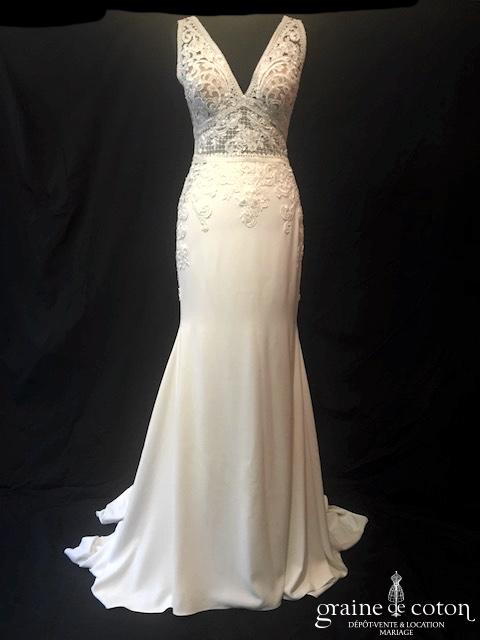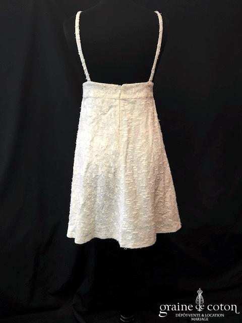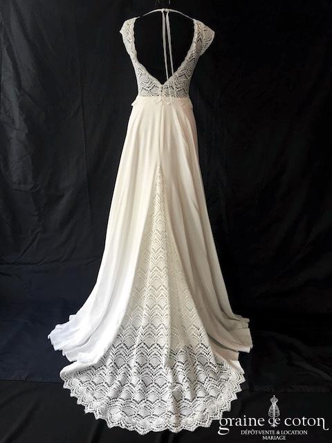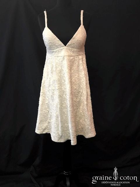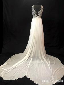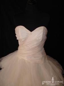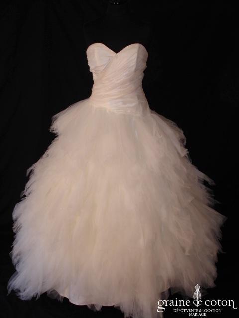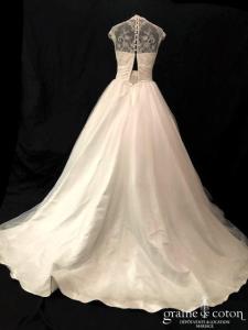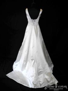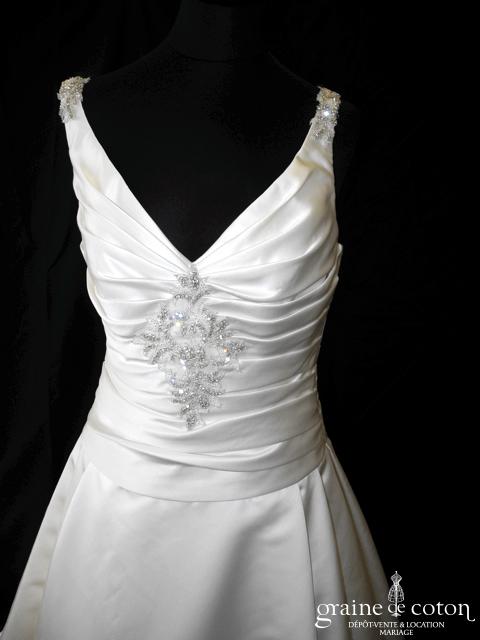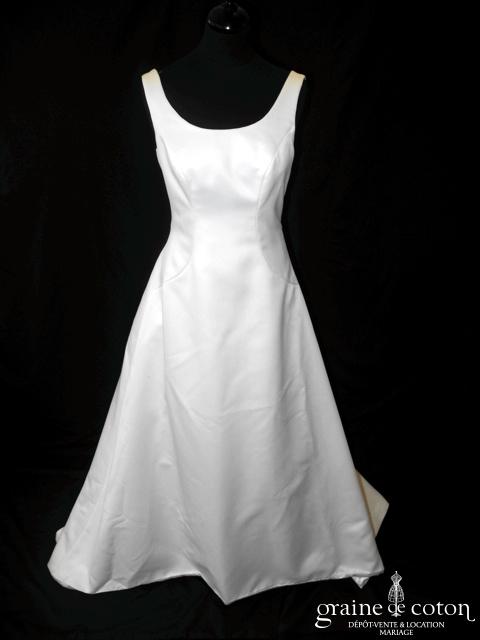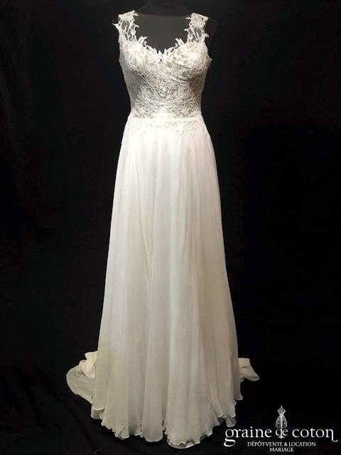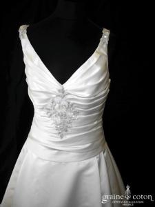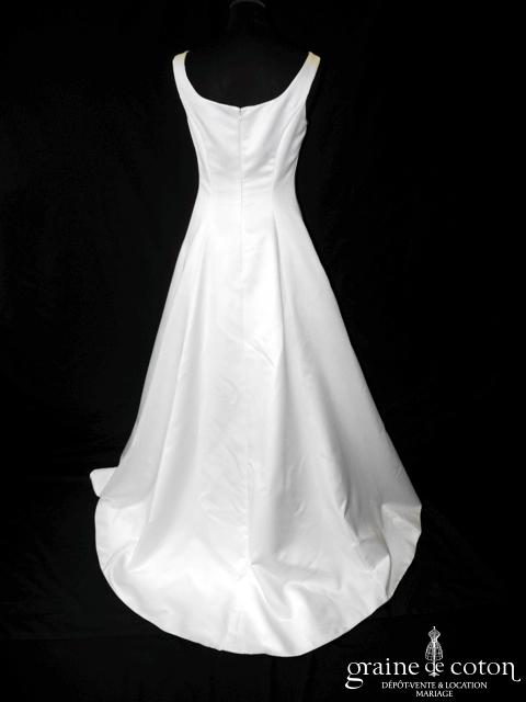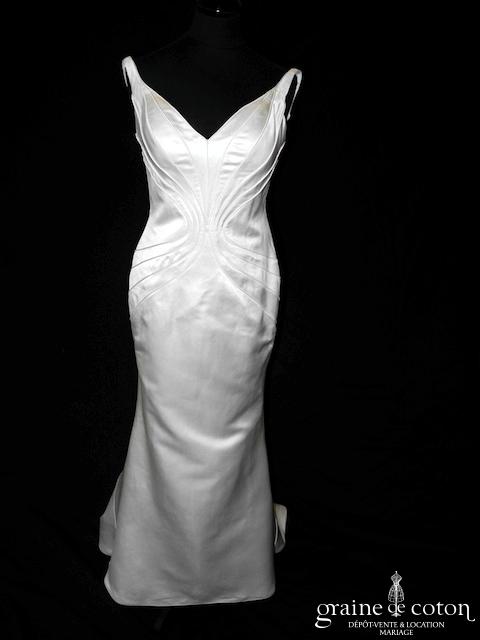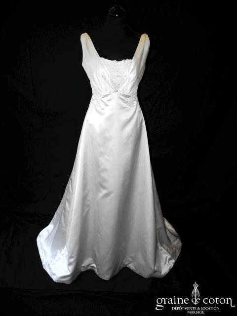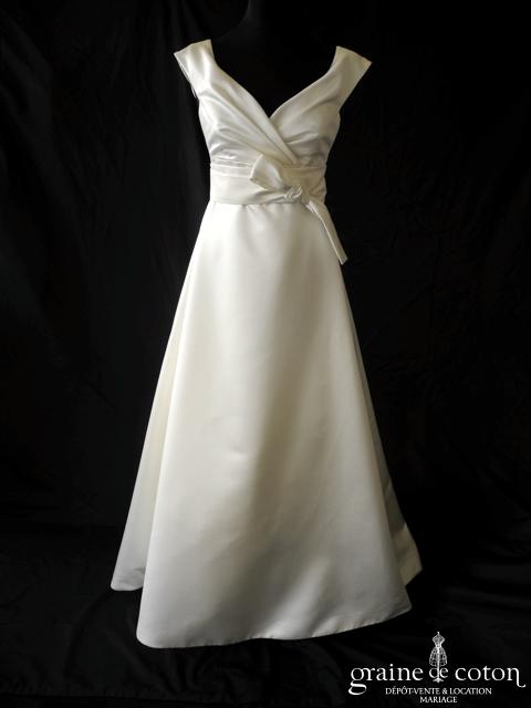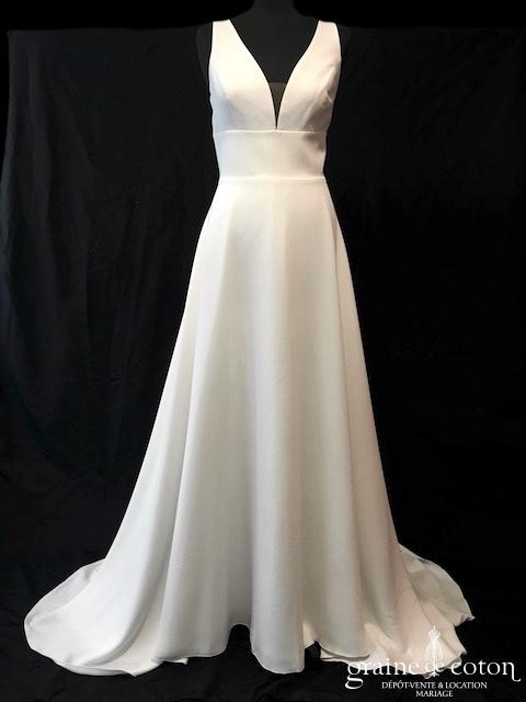 Robe une pièce en soie sauvage blanc drapée de tulle de soie ivoire. Bustier empire avec bretelles formant un décolleté en V, drapé à la taille. Jupe taille basse avec …