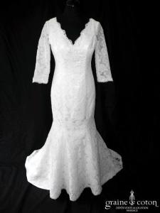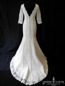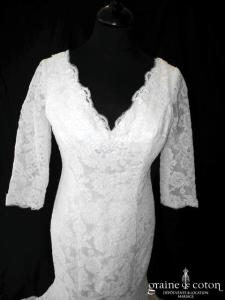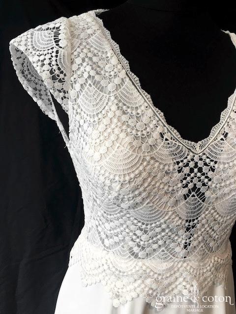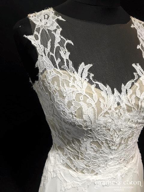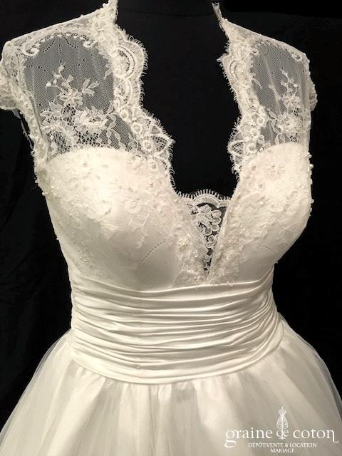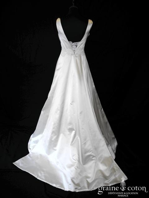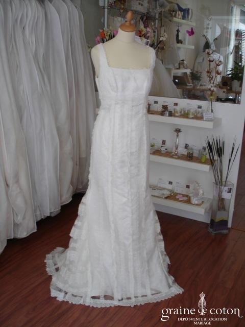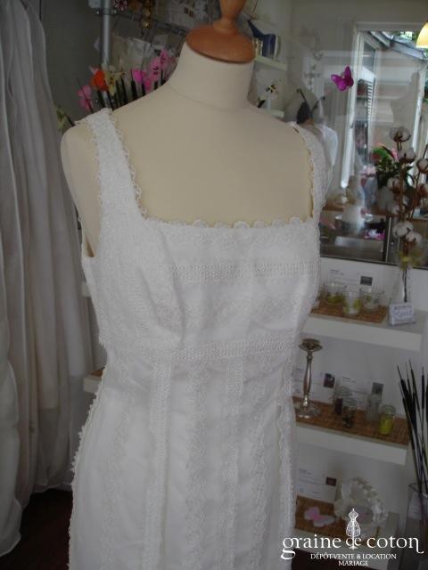 Robe une pièce blanche : décolleté carré bordé d’un galon rappelant la Rome antique. Épurée devant, elle se lace dans le dos et s’ouvre sur du tulle décoré de roses …