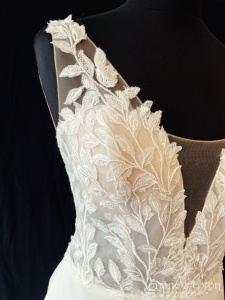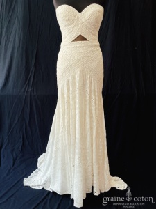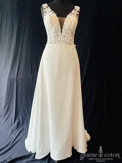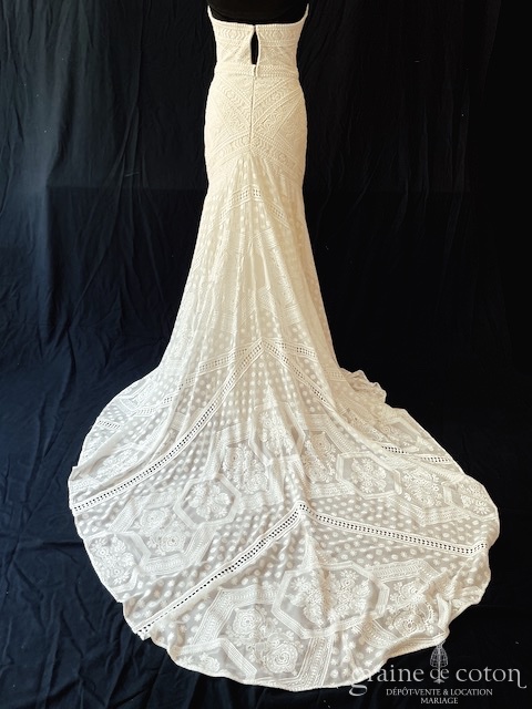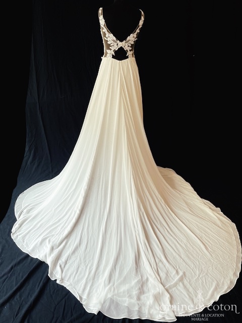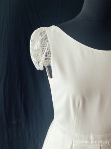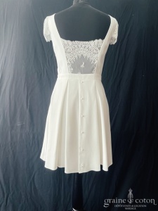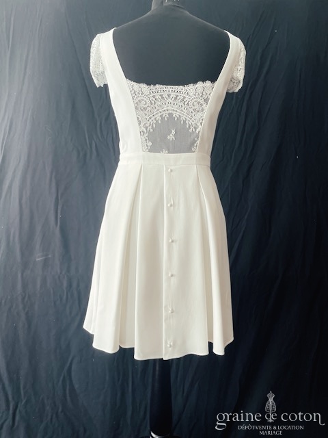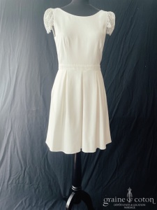 Robe une pièce ivoire clair : top en guipure avec bretelles, dos nu en V. Jupe taille haute soulignée d’une ceinture, en mousseline fluide légèrement évasée avec petite traîne. Légère, …