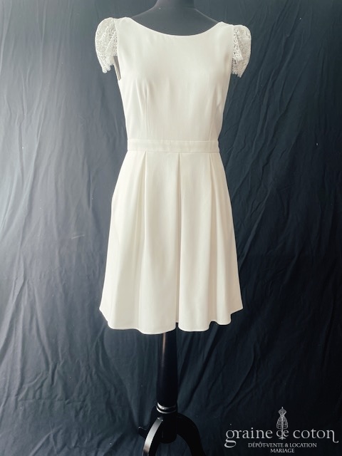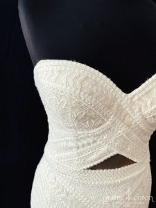 Robe courte au genou droite bustier en dentelle crème, effet drapé. Décolleté forme coeur.