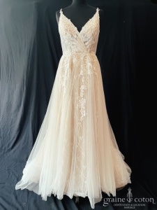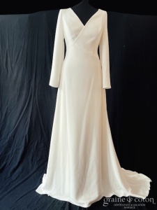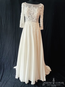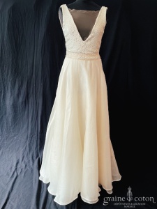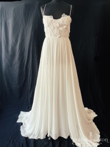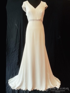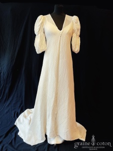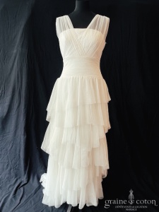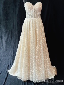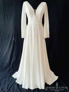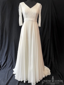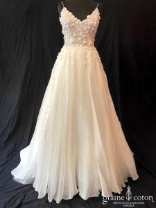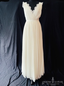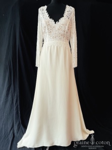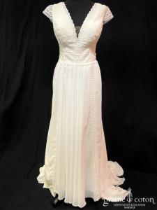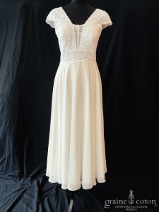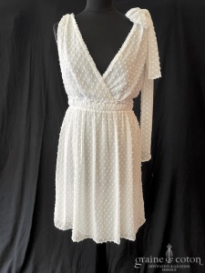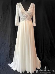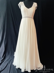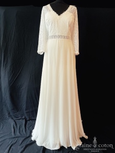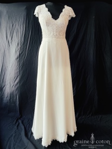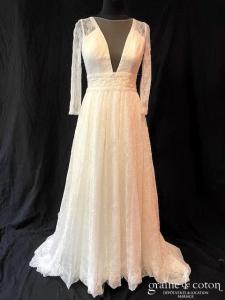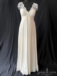 Dépôt du modèle « Camélia » d’Elsa Gary, bohème champêtre en mousseline et dentelles ivoire : taille 38, référence 6364.