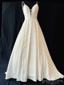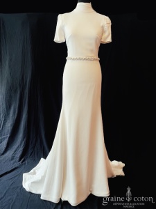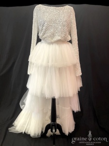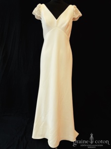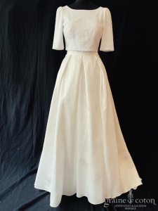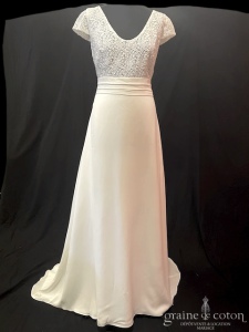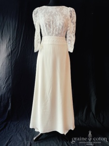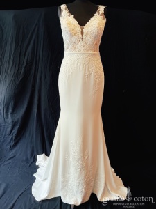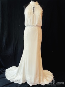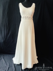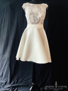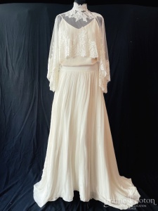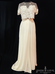Dépôt du modèle « Rhea » d’Alberta Palatchi, en mousseline fluide et dentelle ivoire clair : top encolure américaine, jupe fourreau. Elégante et originale. Taille 38, référence 6349.