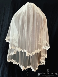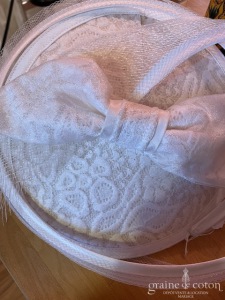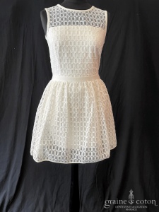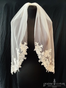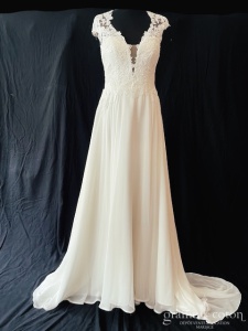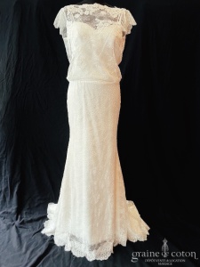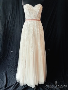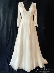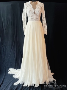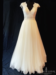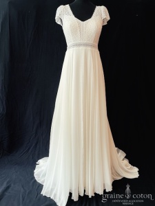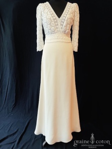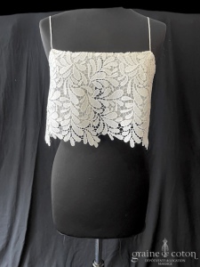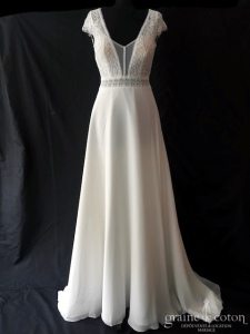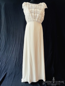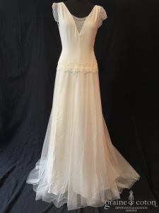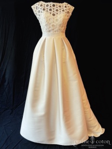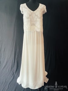 Dépôt du modèle « Ninon » de Marylise : top en guipure décolleté en V, beau dos nu et petites manches ballon. Jupe fluide, esprtit bohème champêtre. Taille 38-40, référence 6352. Voile …