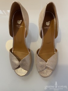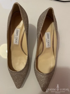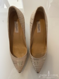 Dépôt d’une création Ralph Lauren en crêpe de soie drapé crème, coupe fourreau, jupe fendue : sobre et classe. Taille 42, référence 6354. Sansales Azia couleur platine de Jimmy Choo, …