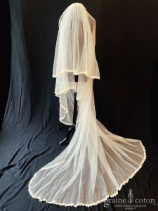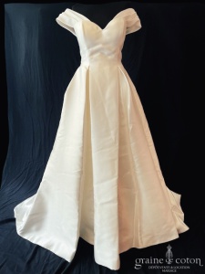 Dépôt du modèle « Inès » de Lorena Formoso en soie ivoire, composée d’une sur-robe gaufrée et d’une sous robe : originale et couture. Taille 38, référence 6348. Voile idéalement assorti référence …