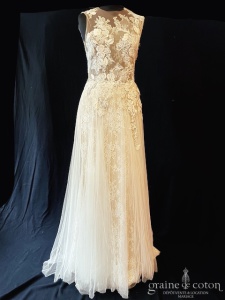 Dépôt du modèle « Taya » de Pronovias : bustier coeur en guipure et jupe princesse en tulle fluide. Lumineuse et seyante ! Taille 40-42, référence 6360.