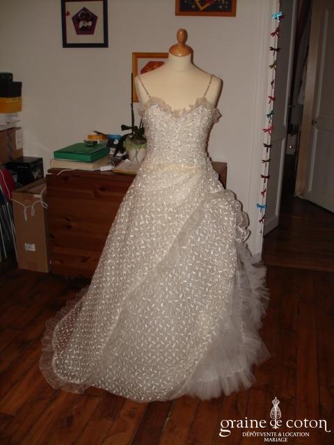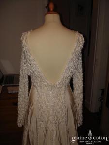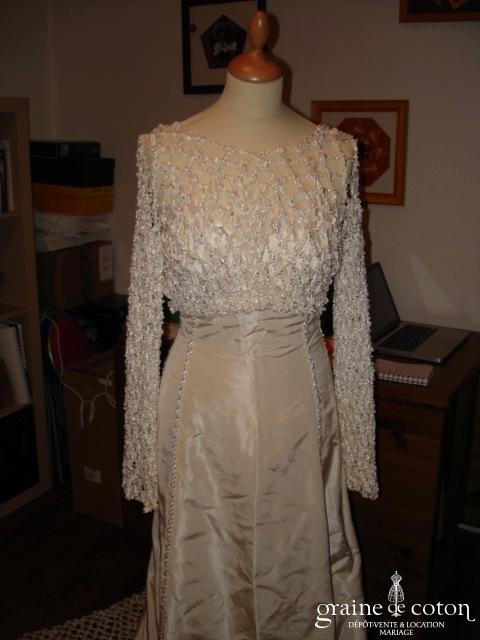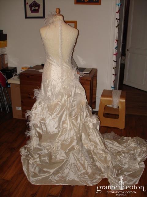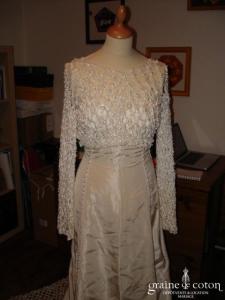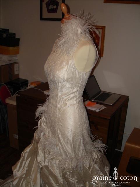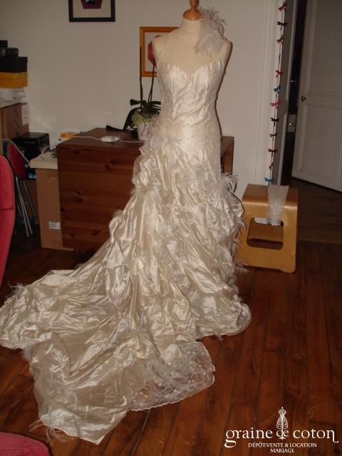 Magnifique modèle fourreau : haut de la robe en dentelle de calais et jupe en soie sauvage crème parsemée de strass et de plumes. Manches amovibles en dentelle assortie. Longue …