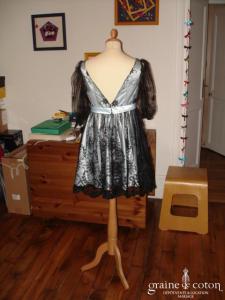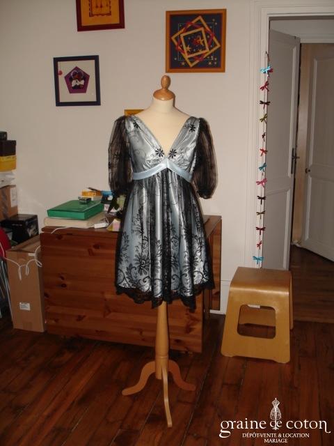 Robe courte en dentelle de calais noire, doublée de satin bleu ciel.