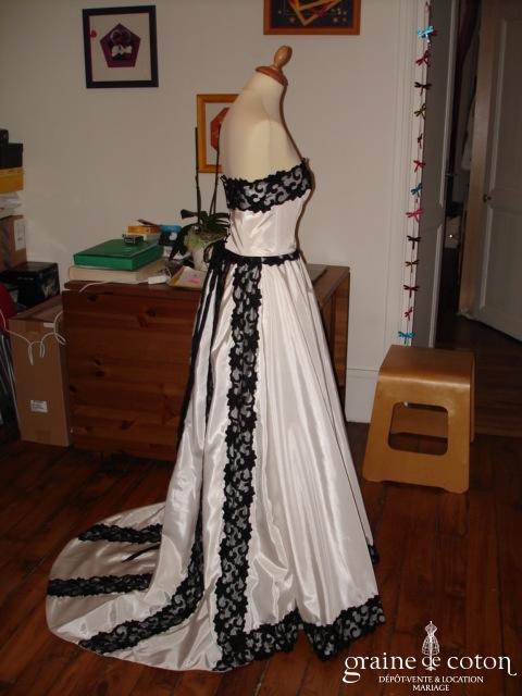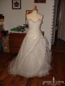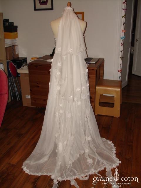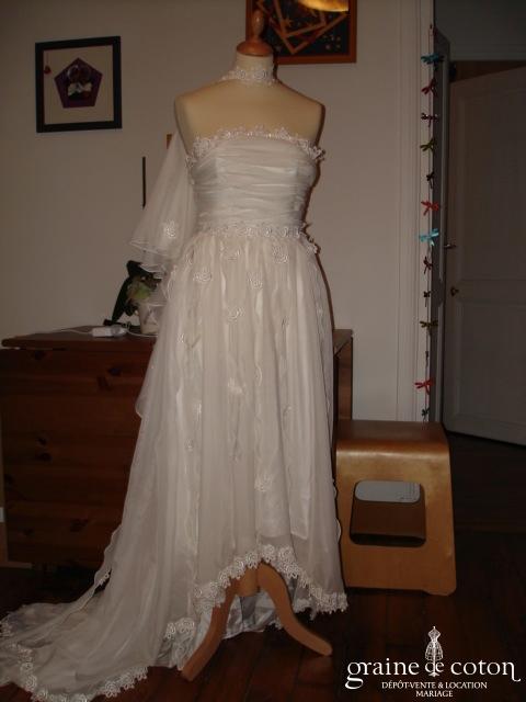Robe mi courte devant et longue derrière, tout en voile et guipure ivoire. Bustier drapé, poitrine soulignée par des fleurs de guipure. Larges et longues manches (s’enfilent comme des gants) …