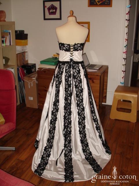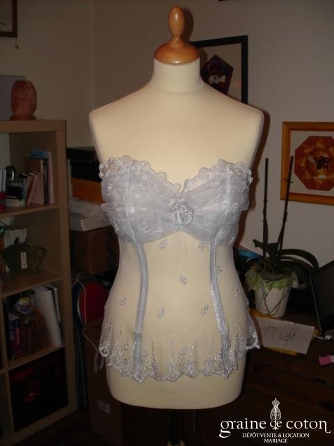 Bustier baleiné en tulle et fine dentelle de calais argent. Dos lacé.