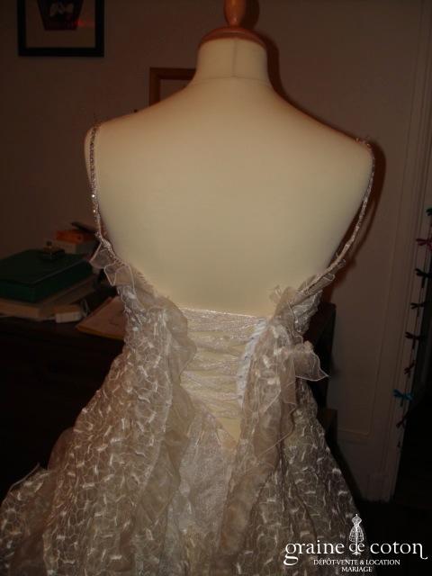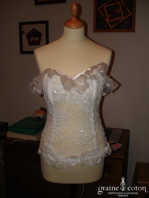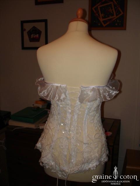 Bustier blanc long et plissé en satin pailleté, bordé de dentelle et strass. Dos ouvert et lacé d’un long ruban d’organza.