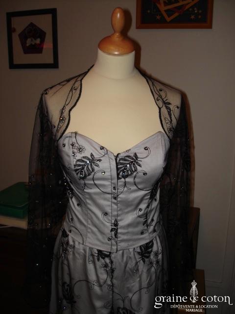 Ensemble pantalon taille haute et bustier noir en dentelle de calais rebrodée de strass. Boléro court assorti.