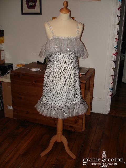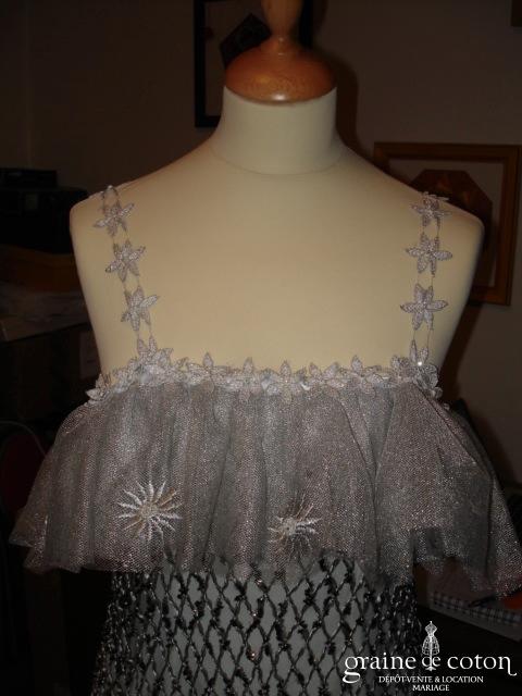 Robe courte noire & argent : maille faite main, tulle argenté et brodé de petites étoiles. Bretelles faites d’étoiles argentées.