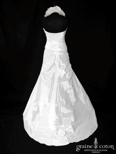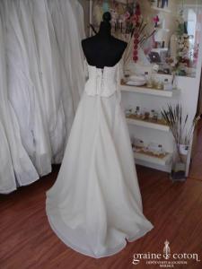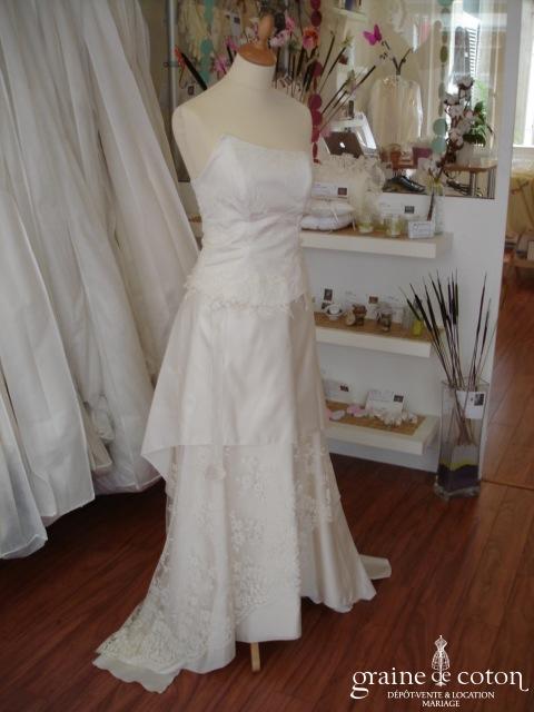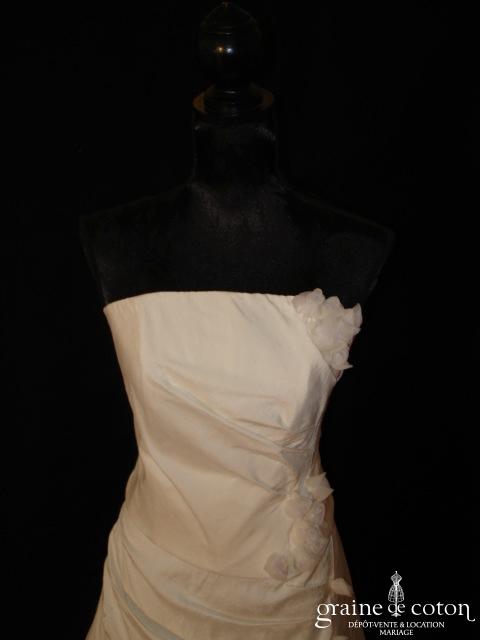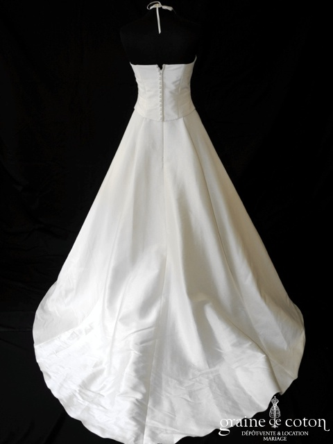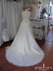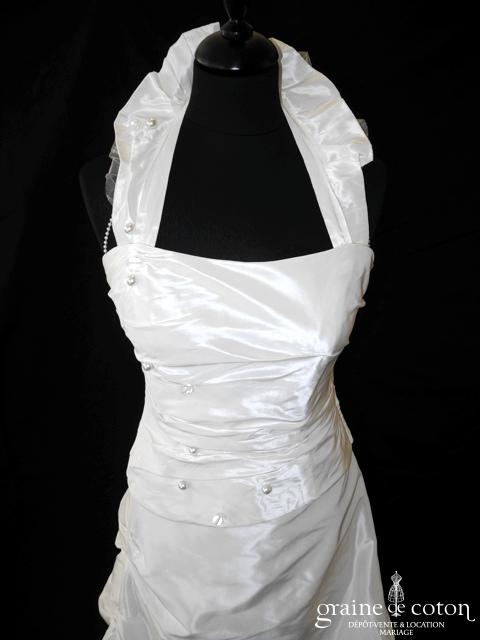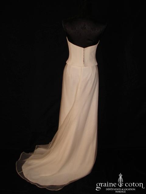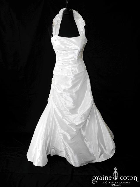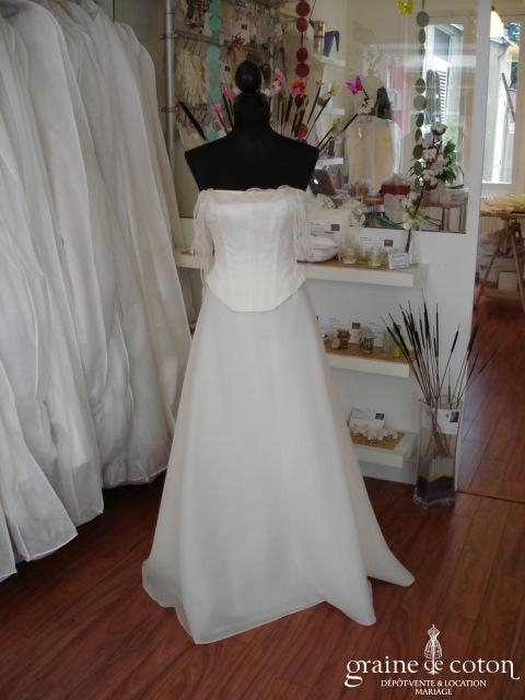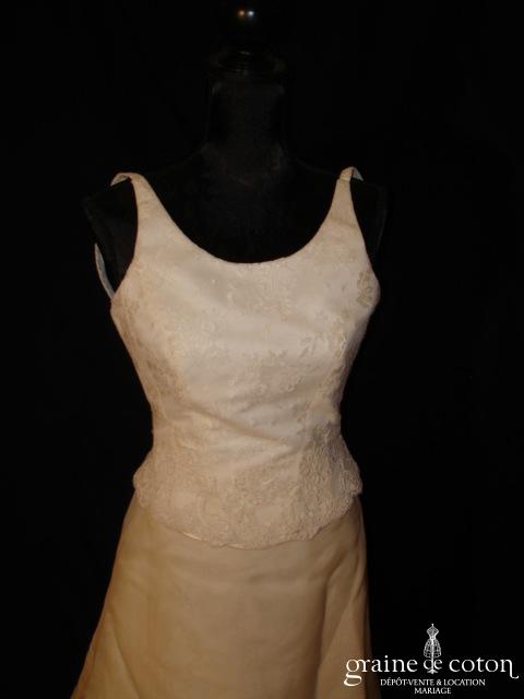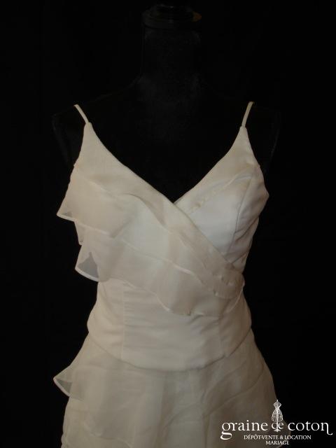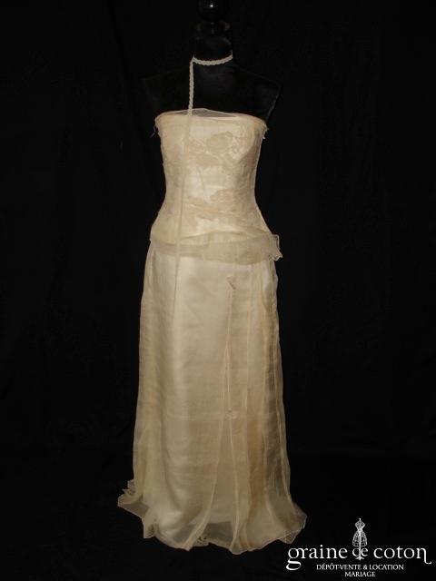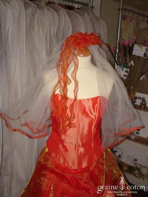 Robe deux pièces : bustier orange moiré, lacé dans le dos. Jupe dans les mêmes matières, recouverte d’un drapé en organza orange. Voile blanc bordé d’un biais orange, étole et …