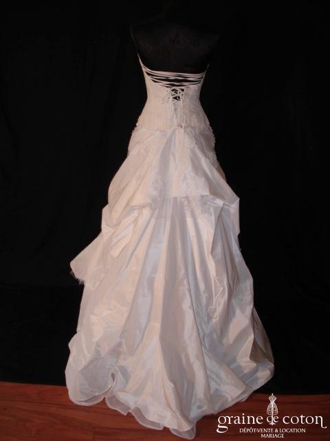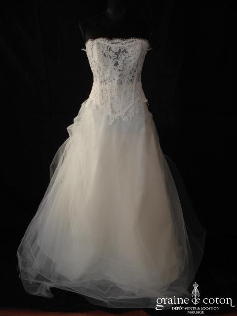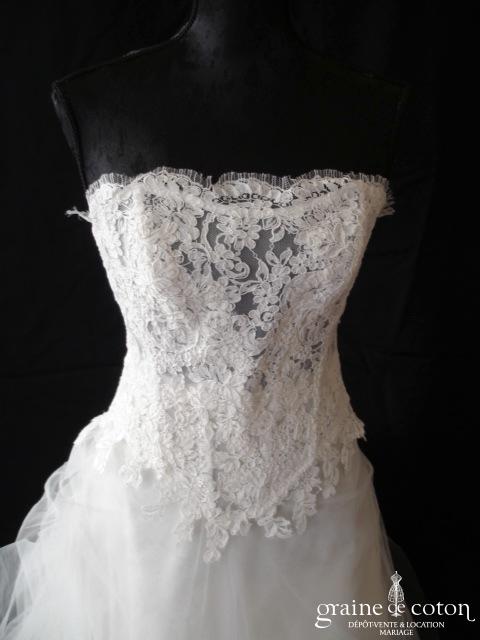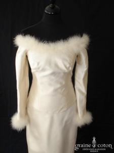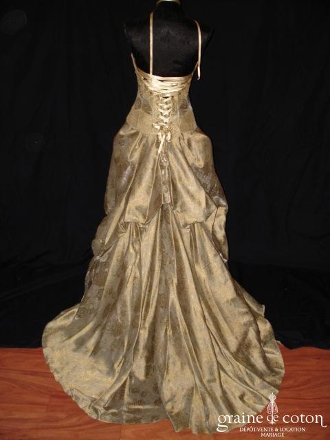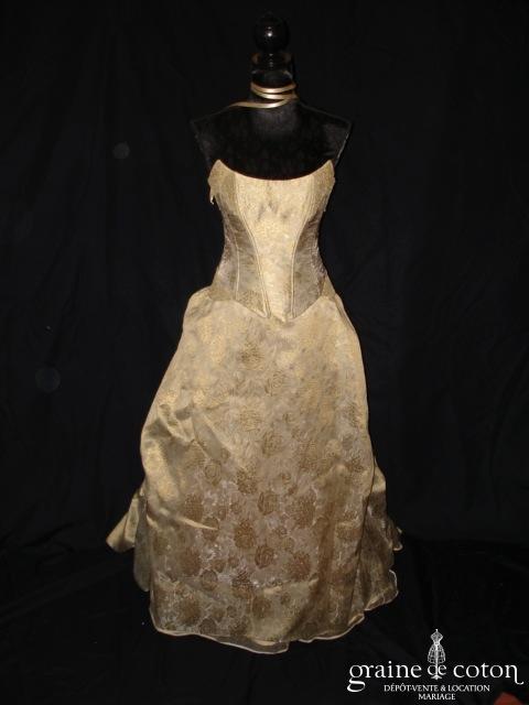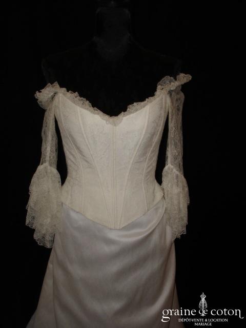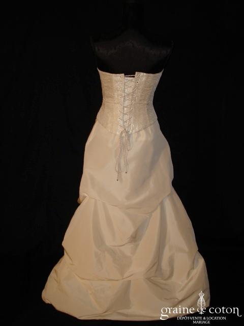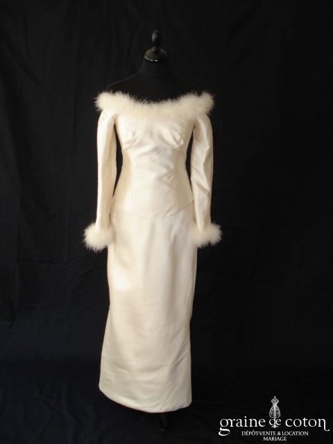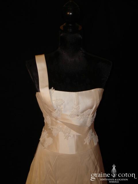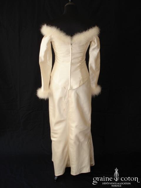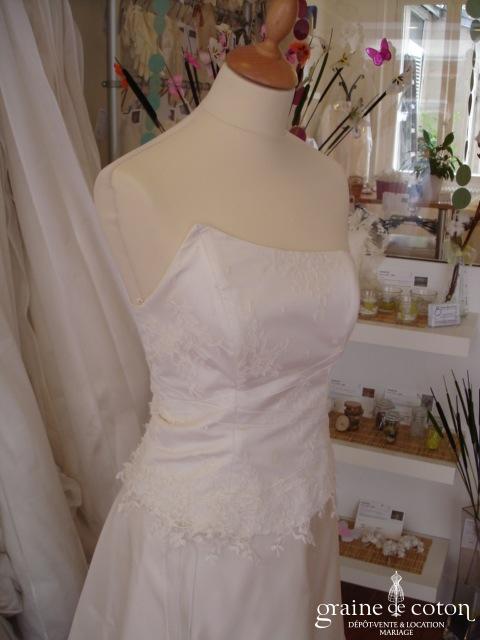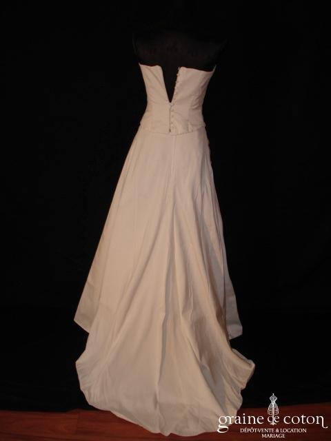 Robe deux pièces : bustier orange moiré, lacé dans le dos. Jupe dans les mêmes matières, recouverte d’un drapé en organza orange. Voile blanc bordé d’un biais orange, étole et …