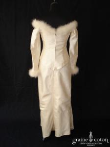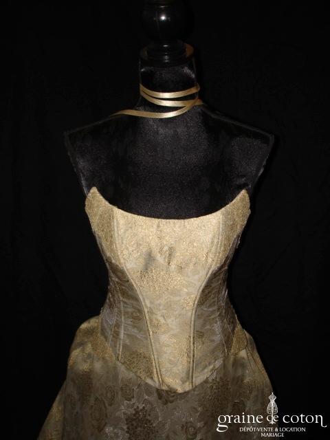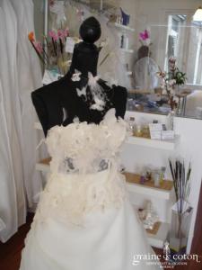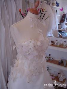 Robe deux pièces recouverte d’organza rose – champagne, faite uniquement en deux exemplaires. Bustier traversé de lanières d’organza et de fines ceintures en crochet, décolleté longé de fleurs brodées. Jupe …