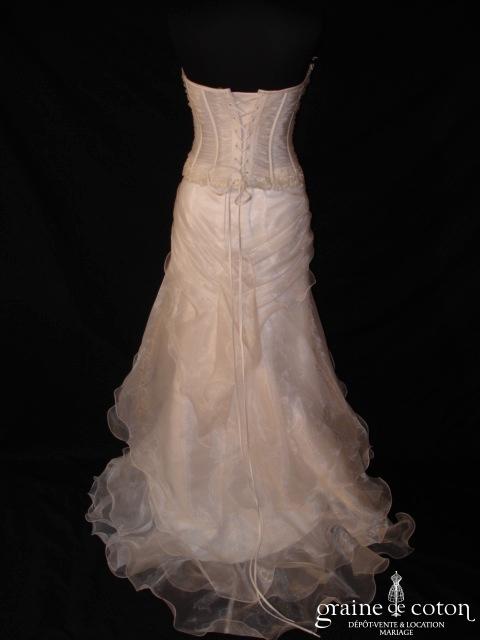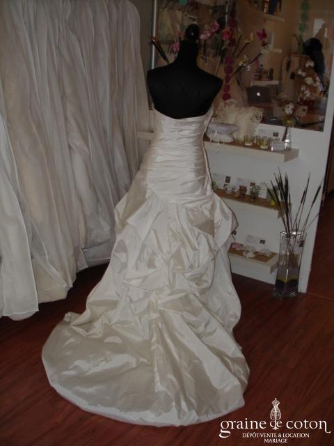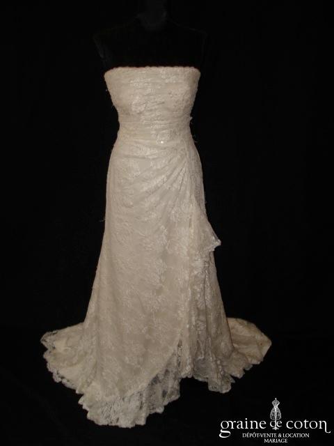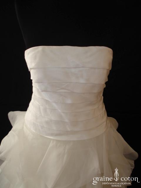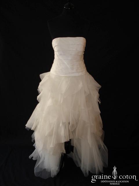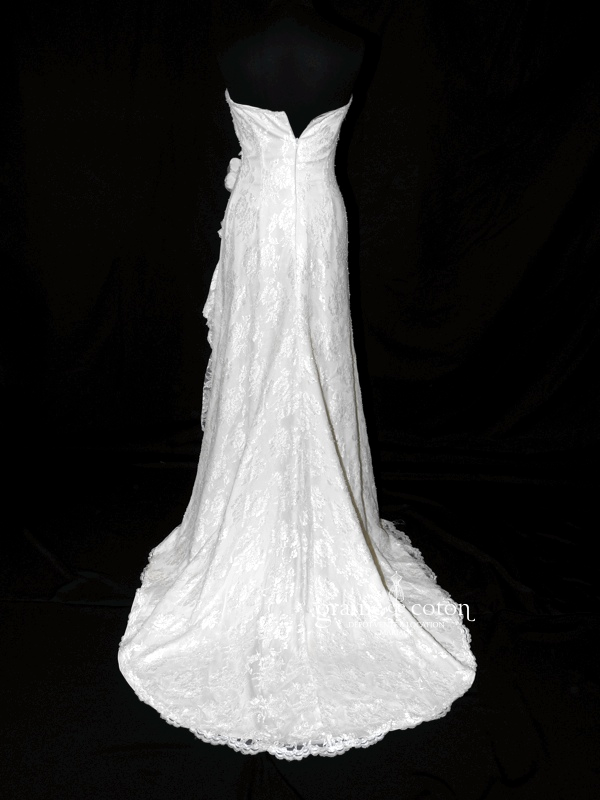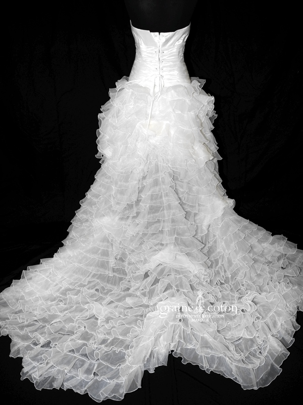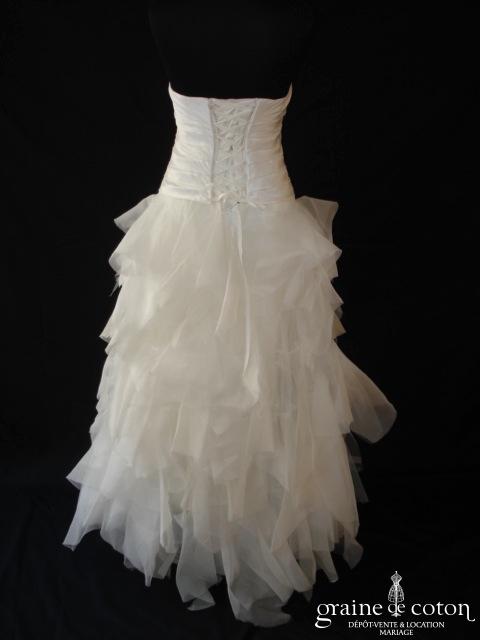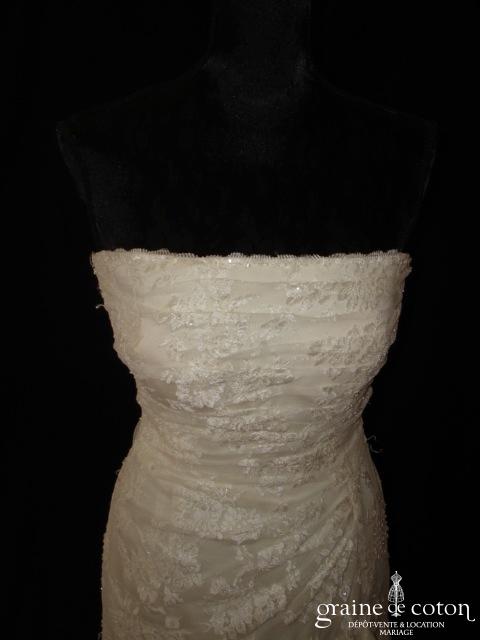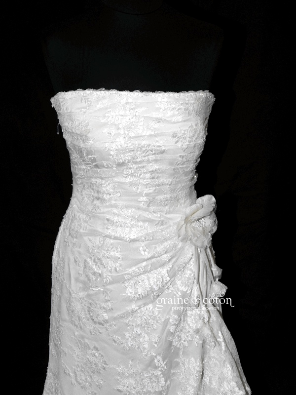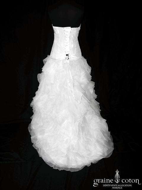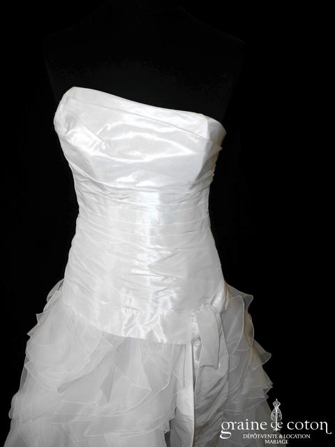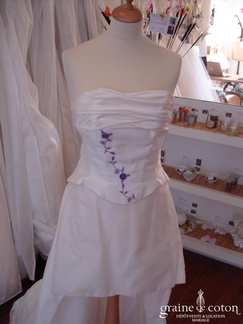 Robe une pièce blanche : bustier plissé et jupe avec dessous en tulle, courte devant. Possibilité d’appliquer de la dentelle fournie, posée pour le moment à l’épingle.