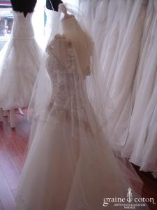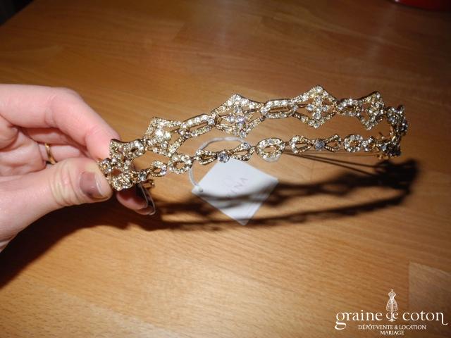 Cache chignon à fixer grâce à 2 rubans en organza. Strass et plumes montés sur fil câblé doré : permet de prendre la forme de la coiffure.