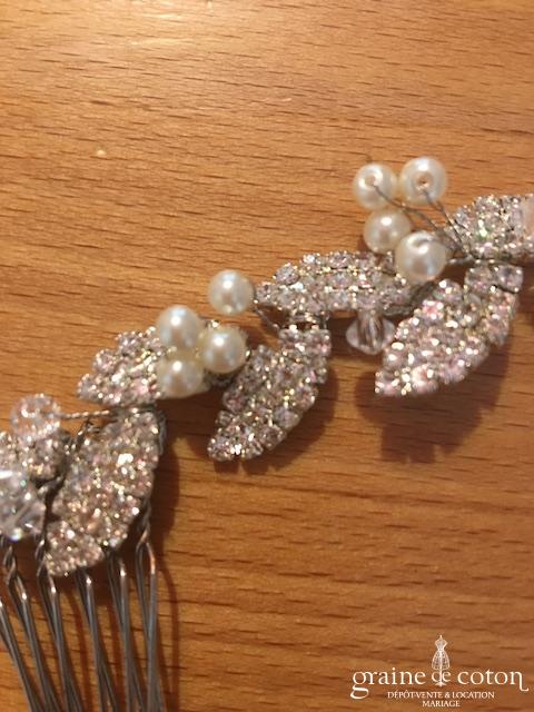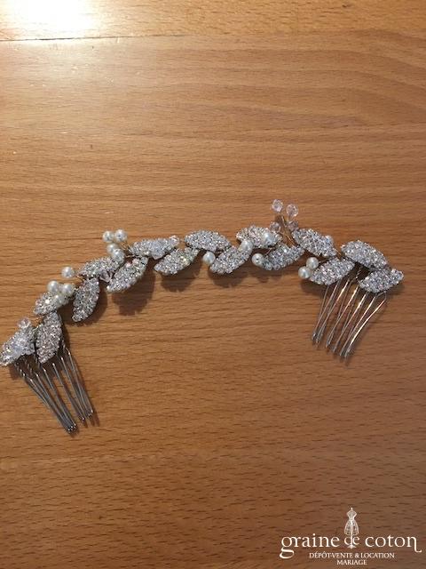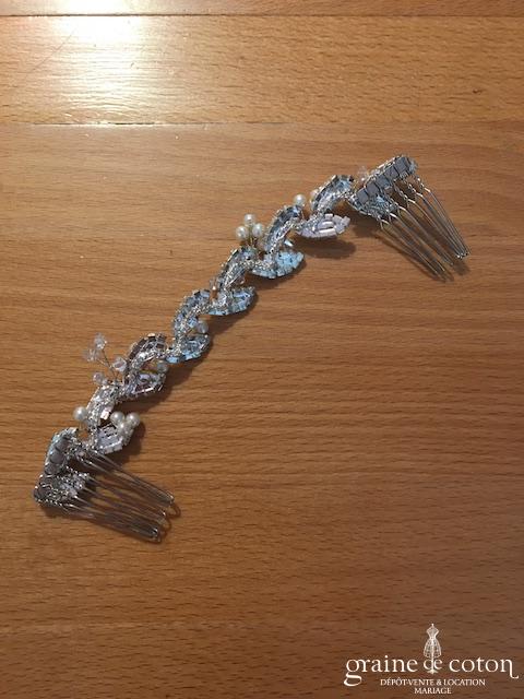 Voile court en tulle ivoire bordé d’un double biais de satin. Monté sur peigne, avec rabat avant.