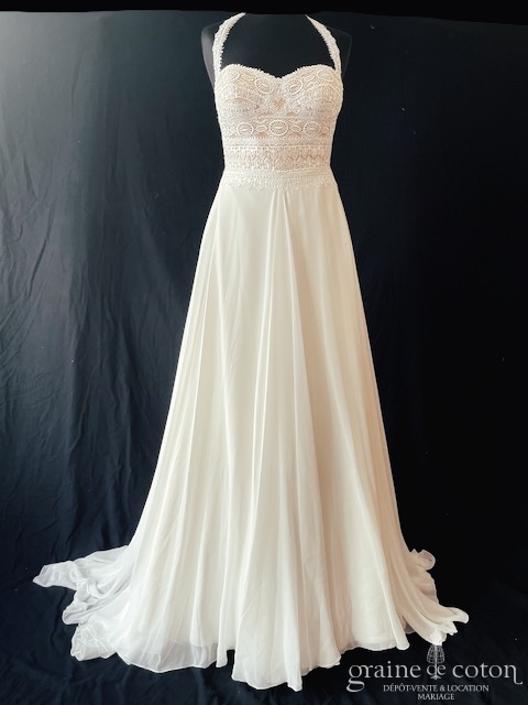 Dépôt de 2 robes : – la robe « Drenube » de Pronovias, en guipure et mousseline fluide, esprit bohème chic. Taille 38, référece 6248. – le modèle « Woolf » d’Atelier Pronovias en …
