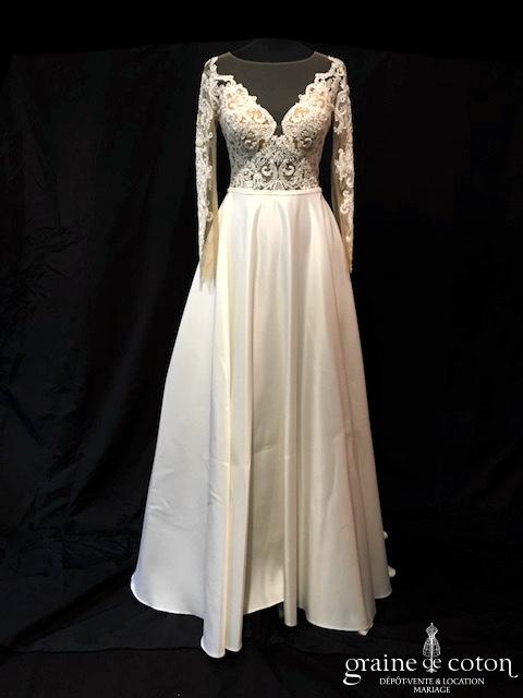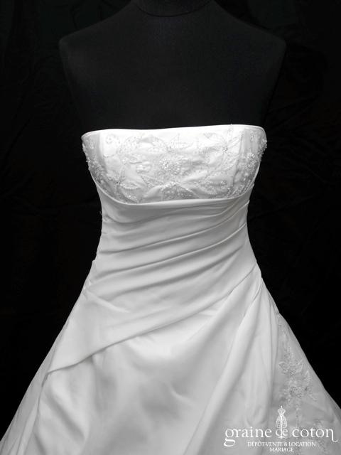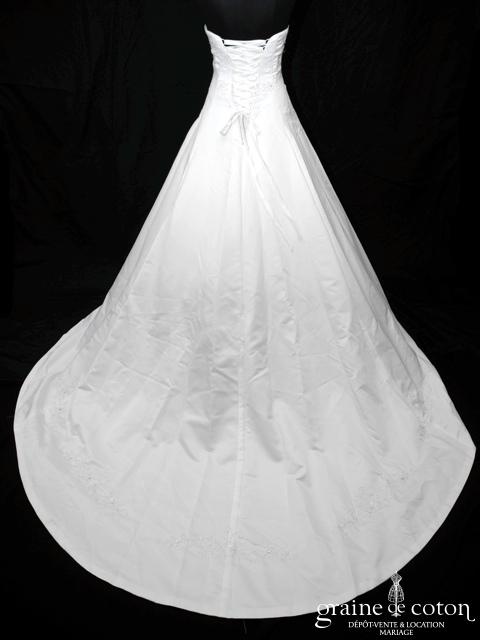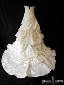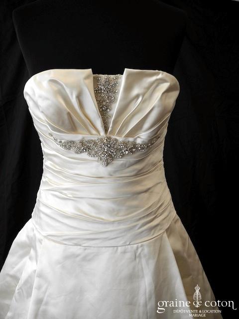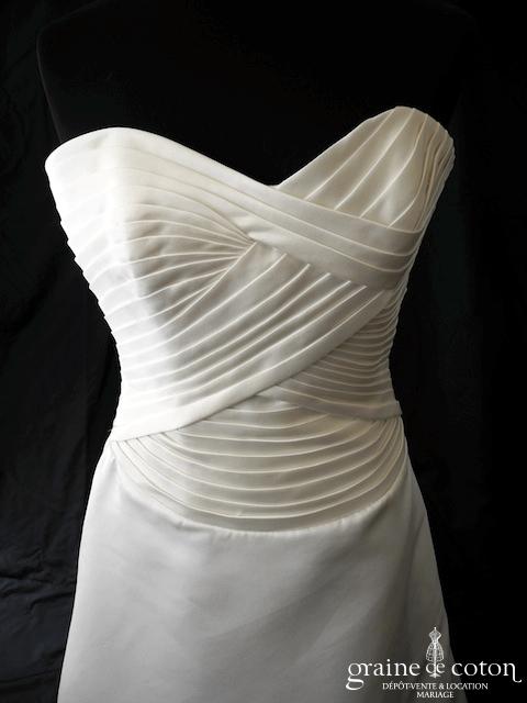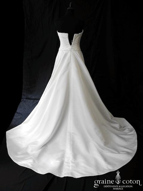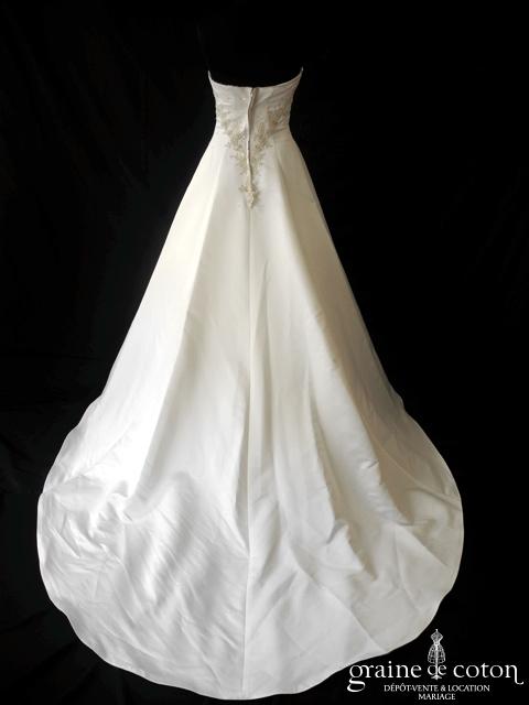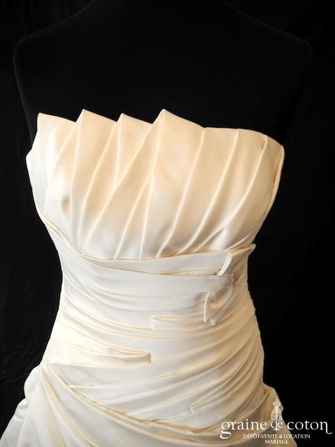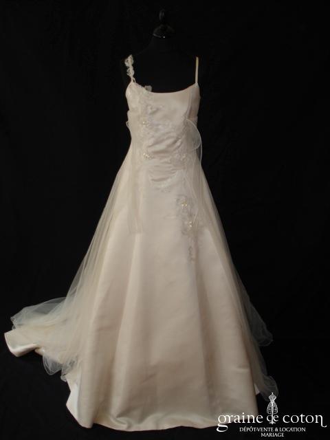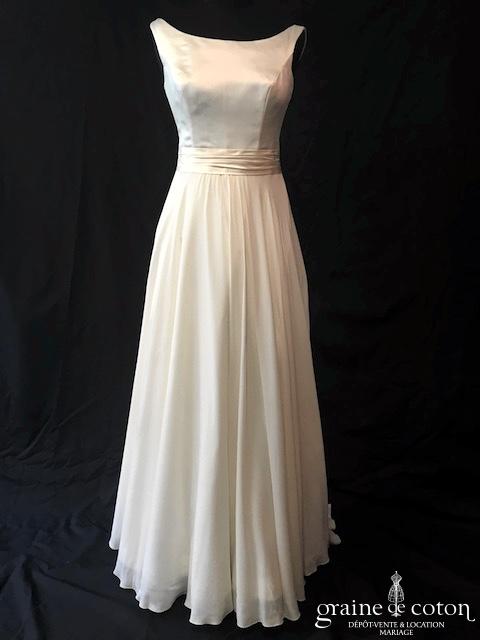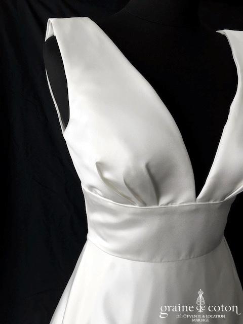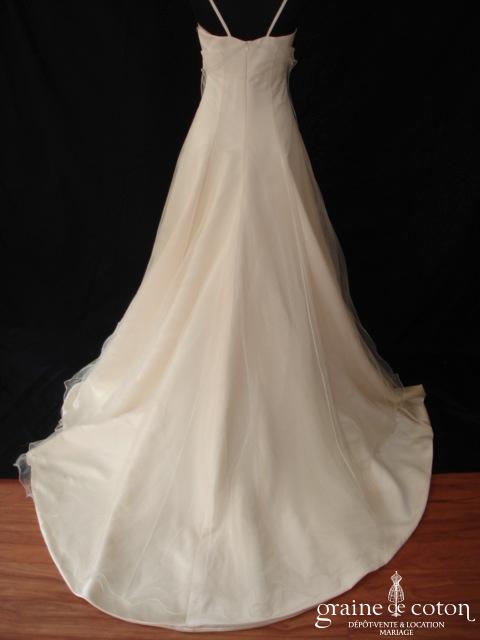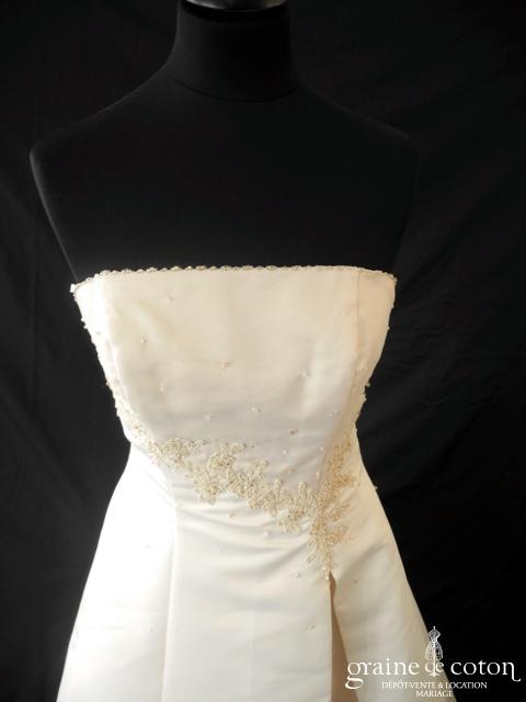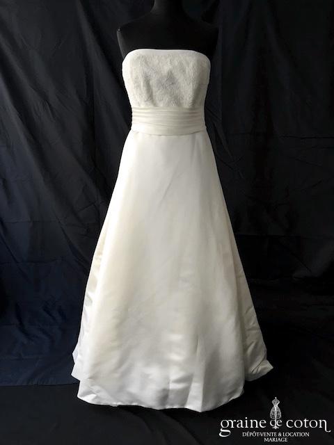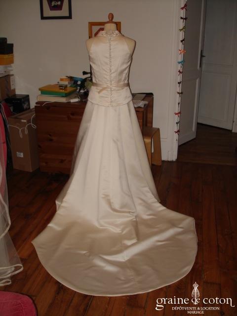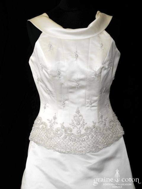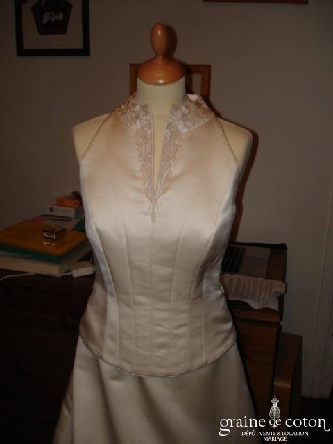 Robe en satin duchesse ivoire en une pièce, imitation deux pièces. Bustier très travaillé, décolleté recouvert d’une délicate bande de tulle pailleté, bretelles. Longue jupe très simple afin que le …