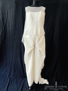 Dépôt du modèle « Rhea » d’Alberta Palatchi, en mousseline fluide et dentelle ivoire clair : top encolure américaine, jupe fourreau. Elégante et originale. Taille 38, référence 6349.