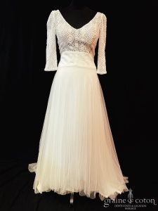 Dépôt du modèle « Ninon » de Marylise : top en guipure décolleté en V, beau dos nu et petites manches ballon. Jupe fluide, esprtit bohème champêtre. Taille 38-40, référence 6352. Voile …