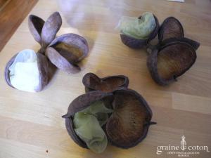 Écorce double pour une déco bio ! Très originale, cette véritable écorce façon bogue triple a été aménagée avec des tissus de couleur. A vous d’imaginer son intégration dans votre …