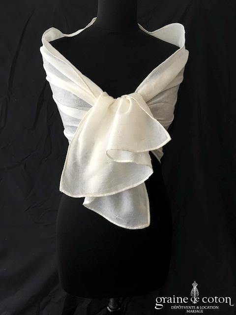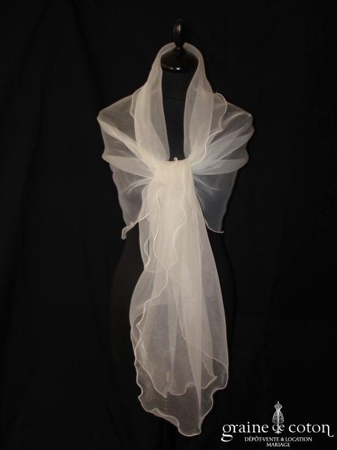 Étole en organza ivoire, bords surjetés pour un effet de volutes. Dimensions : 220 cm * 90 cm.