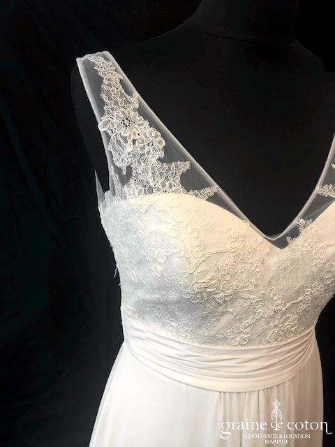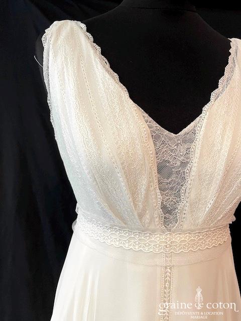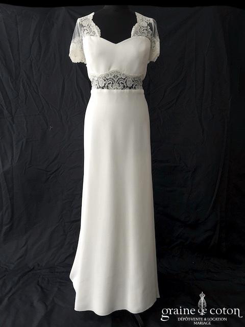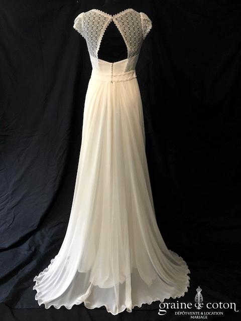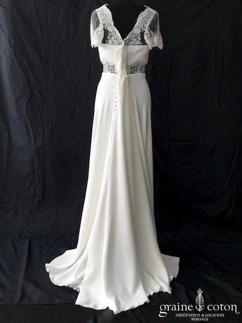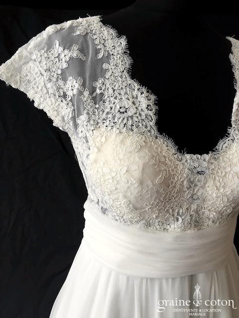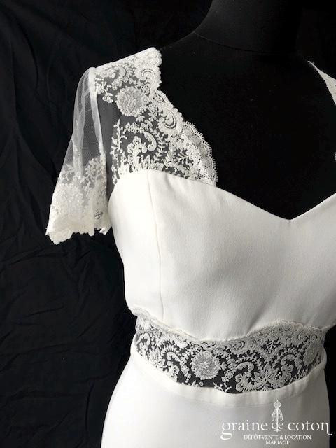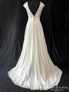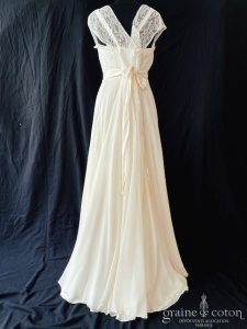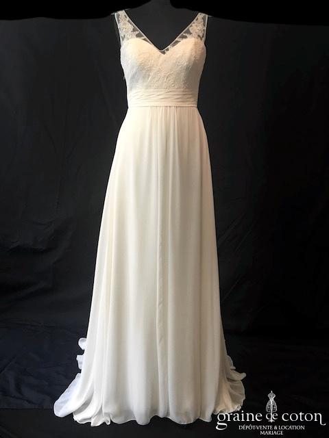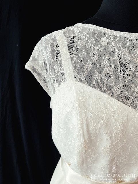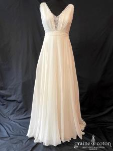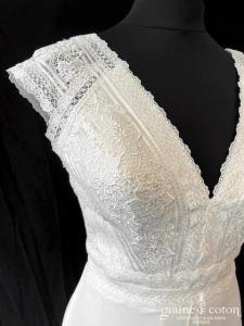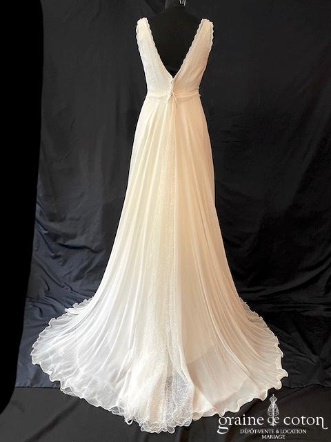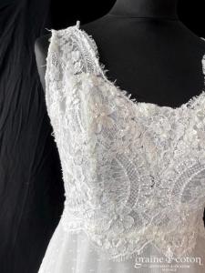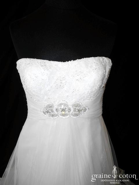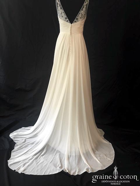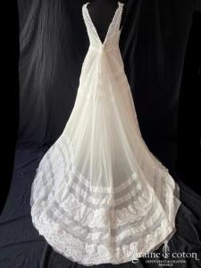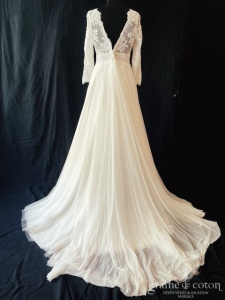 Robe une pièce tout en tulle fluide ivoire clair : bustier coeur recouvert d’un tulle perlé, dos en V boutonné et petites manches. Jupe taille haute ceinturée, en tulle fluide, …