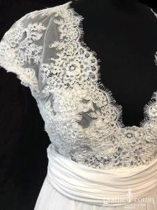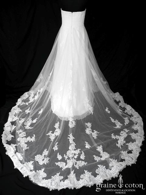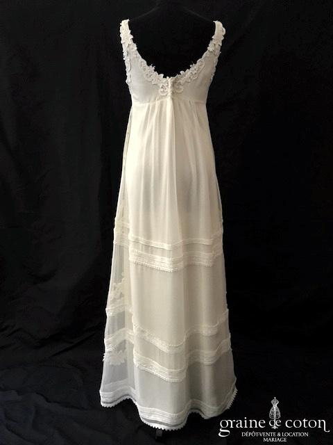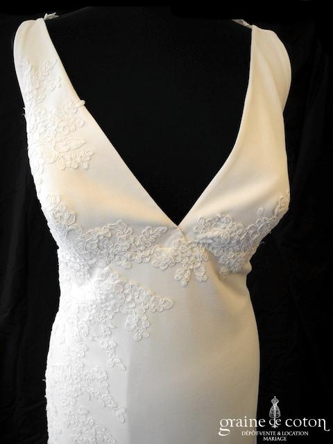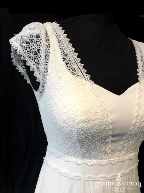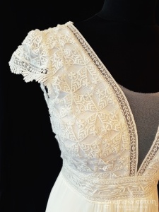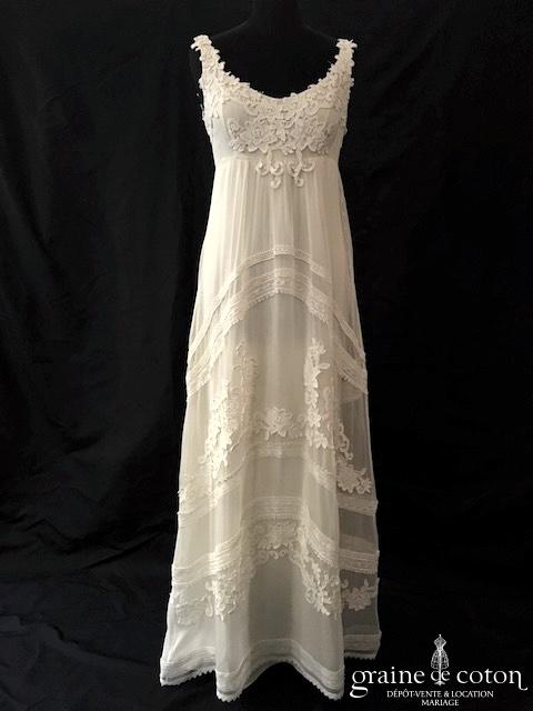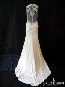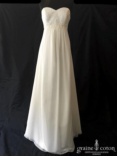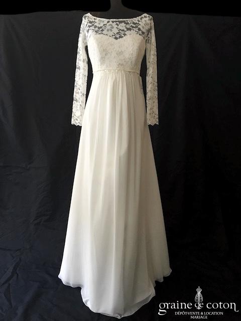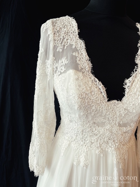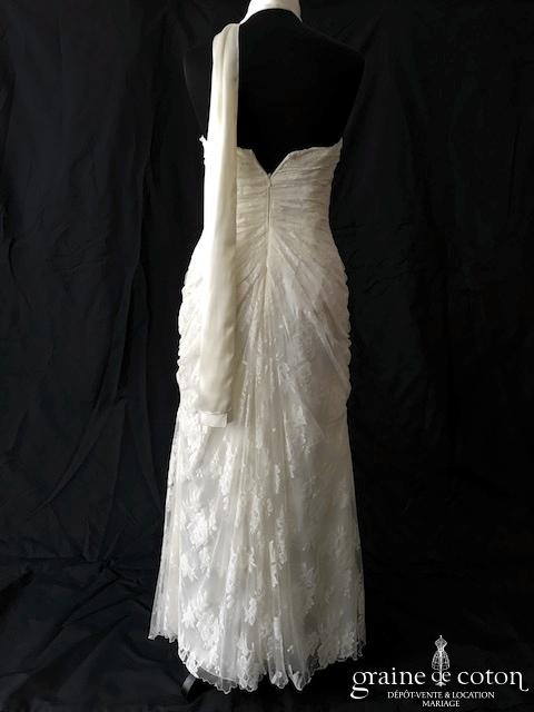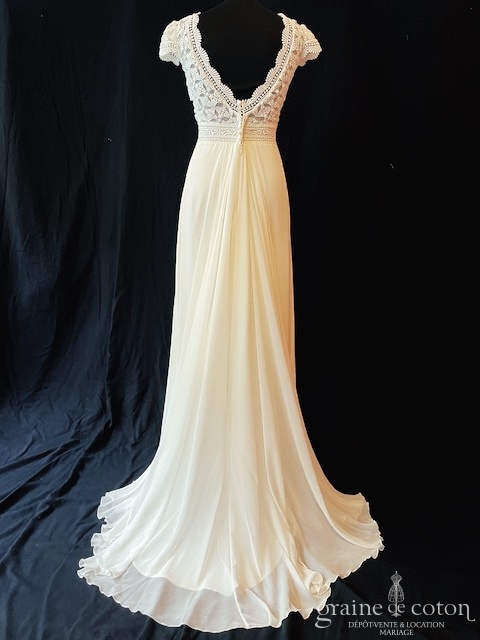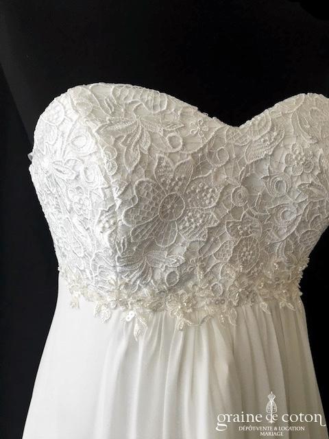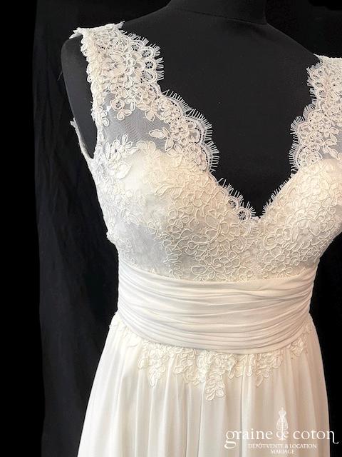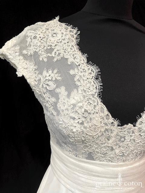 Robe une pièce tout en tulle fluide ivoire clair : bustier coeur recouvert d’un tulle perlé, dos en V boutonné et petites manches. Jupe taille haute ceinturée, en tulle fluide, …