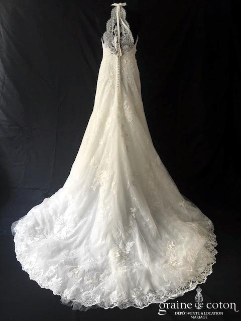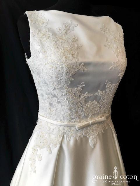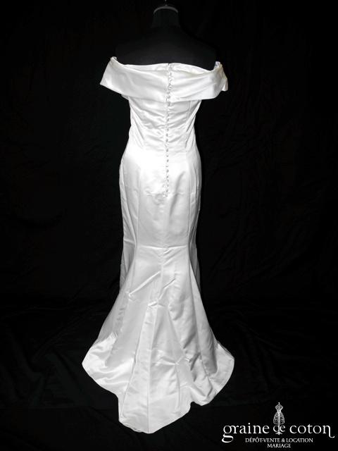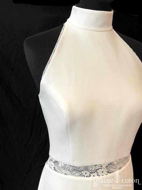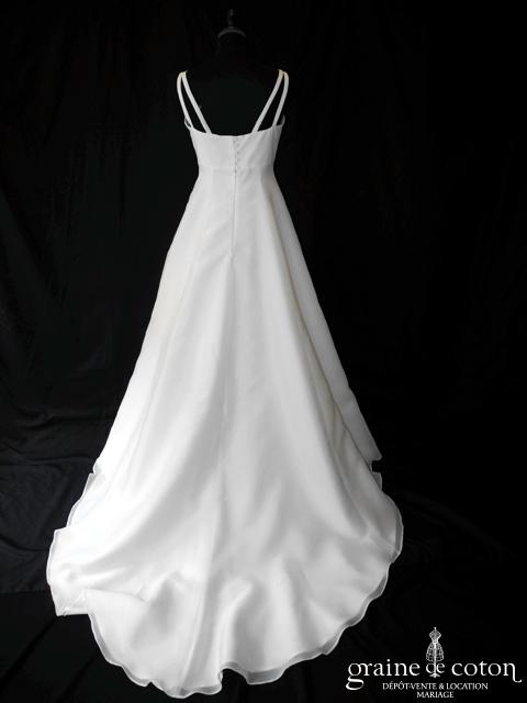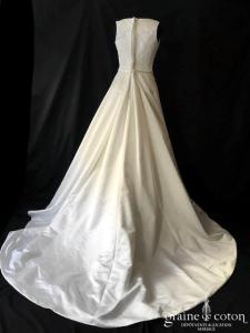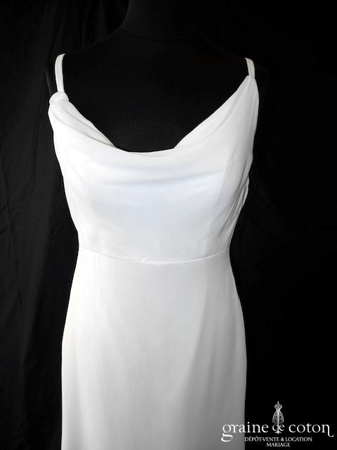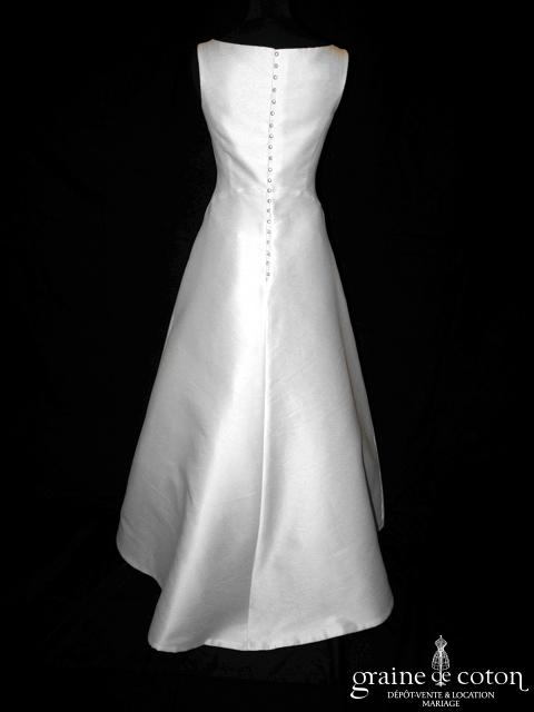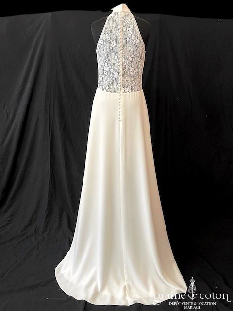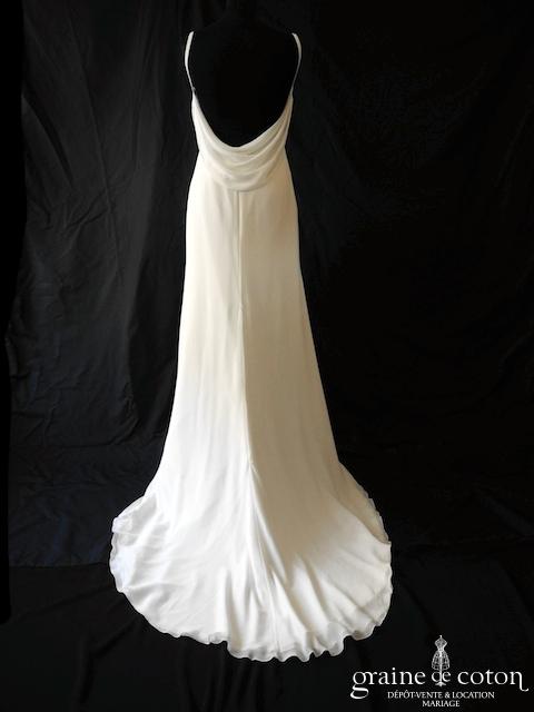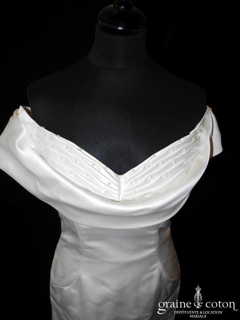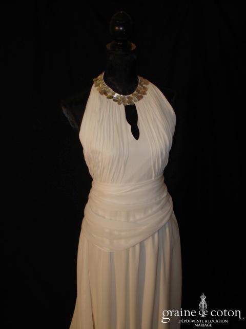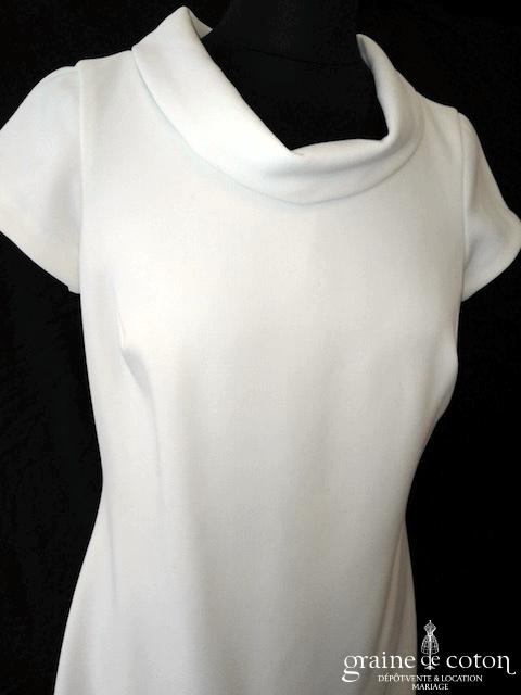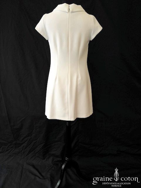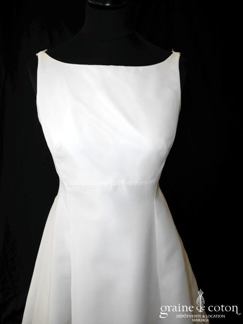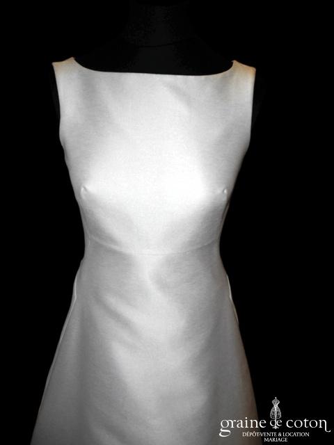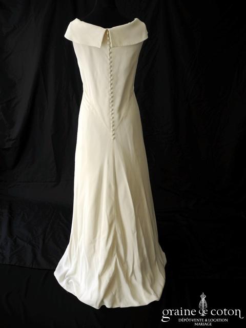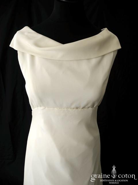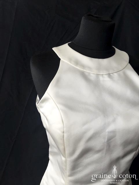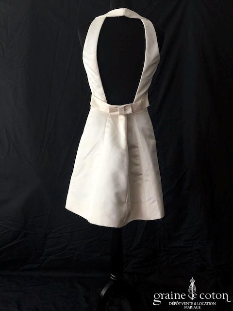 Robe en soie ivoire : encolure américaine et dos nu. Jupe courte au genou. Belle tenue, idéale en 2e tenue civile ou pour la soirée.