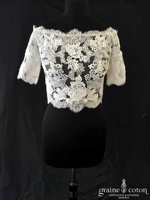 Boléro en fine dentelle de Chantilly ivoire à manches courtes et encolure bateau