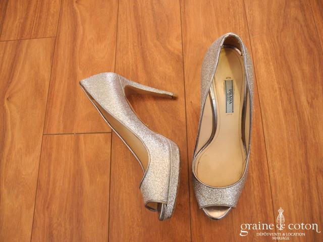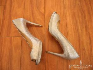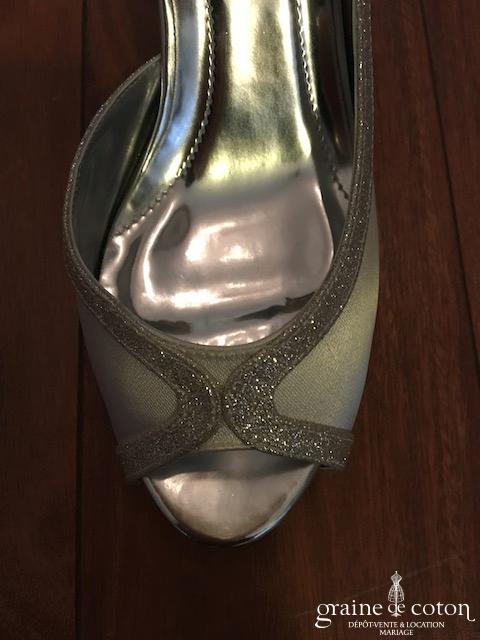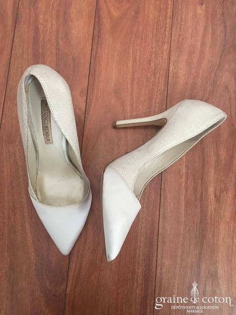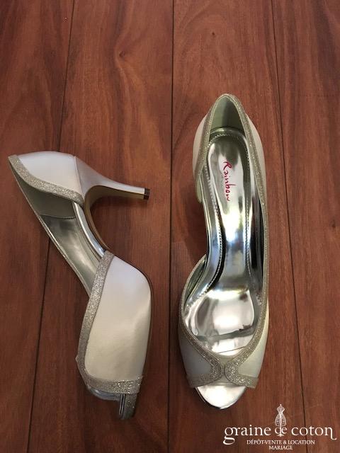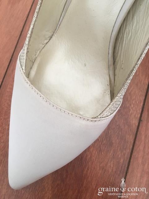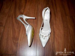 Escarpins en satin ivoire, ouverts sur le devant et avec petit noeud au dos de la cheville. Talon 9 cm.