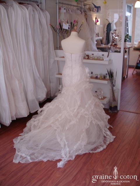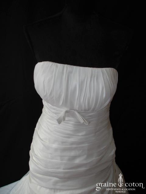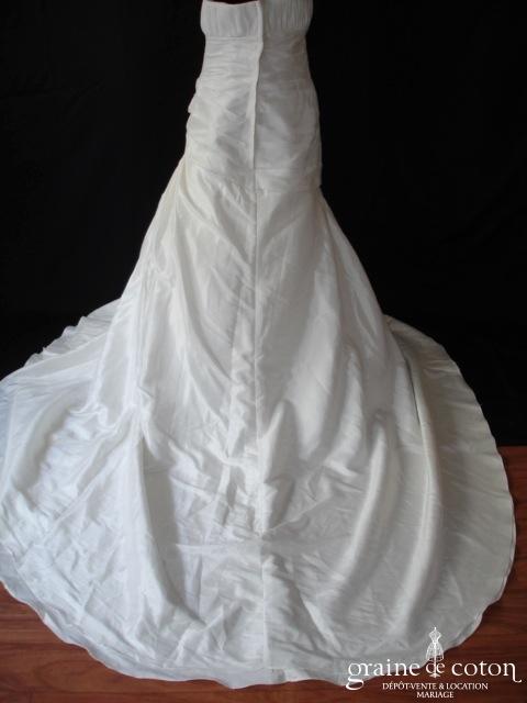 Robe une pièce en taffetas blanc : bustier taille empire soulignée d’un noeud, drapé pour une silhouette affinée. Jupe taille basse avec longue traîne. Un modèle frais et léger.