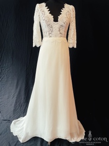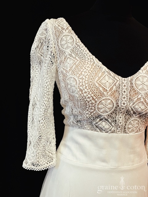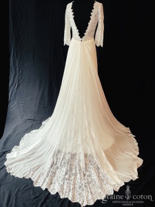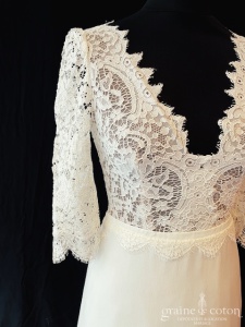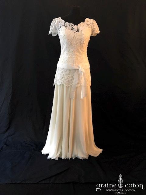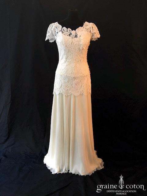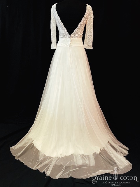 Robe une pièce ivoire clair : top en dentelle de Calais, décolleté V et dos nu, manches 3/4. Jupe taille haute en mousseline de soie fluide, traîne avec quille de …