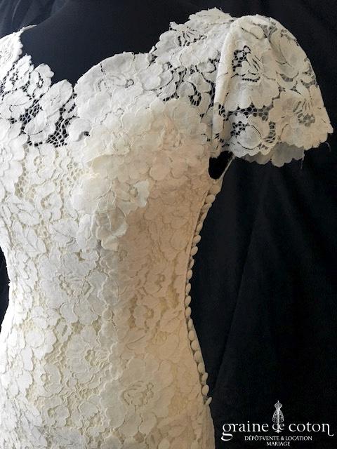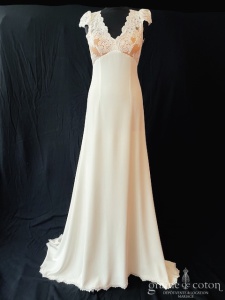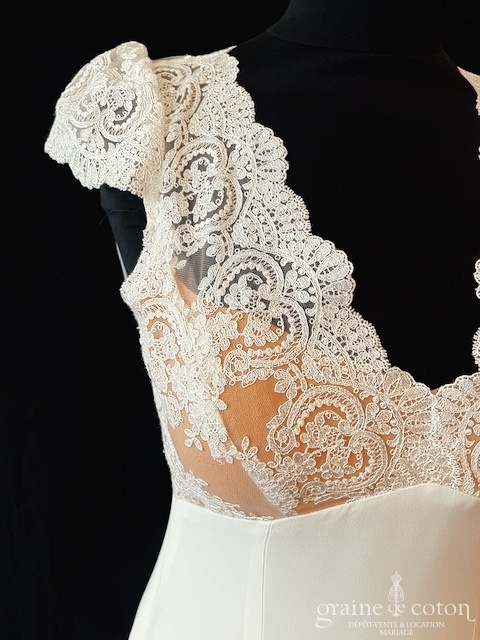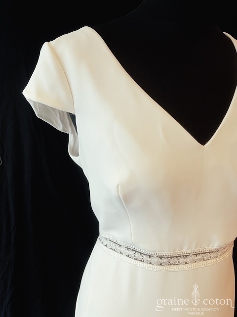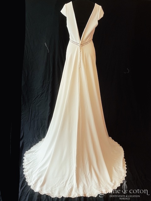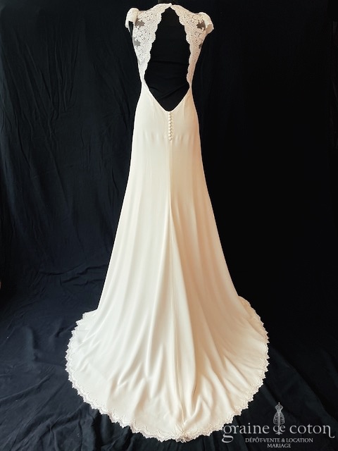 Robe une pièce ivoire clair : top empire en dentelle avec petites manches, décolleté en V et profond dos nu. Jupe fourreau en crêpe de soie fluide, petite traîne, ourlet …