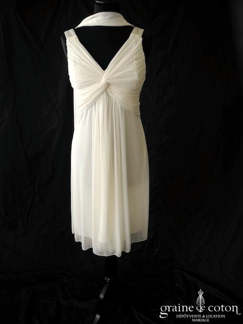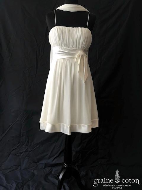 Robe une pièce en mousseline ivoire : bustier empire drapé avec fines bretelles. Jupe courte (au genou) fluide en mousseline. Étole assortie en mousseline incluse. Pure et légère, idéale pour …