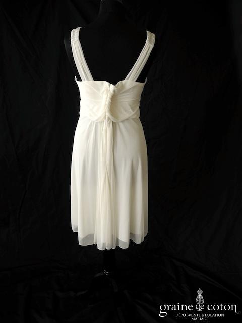 Robe courte asymétrique en mousseline ivoire : bustier avec col bénitier et dos en V, taille basse avec ceinture de satin. Broche fleur sur la taille. Jupe fluide asymétrique, sous …