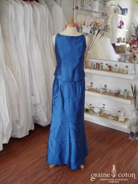 Ensemble jupe longue et bustier bleu vif. Décolleté type américain, avec larges bretelles. Habillé, sobre et confortable.