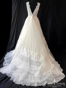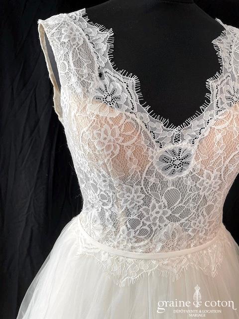 Robe une pièce ivoire clair : top en fine dentelle avec bretelles et décolletés V. Dos nu. Jupe taille haute en tulle effet princesse : rappel de la dentelle du …
