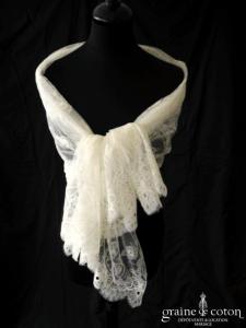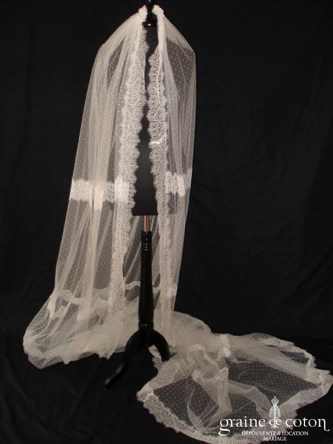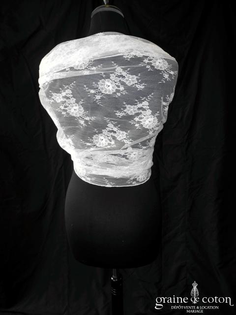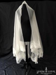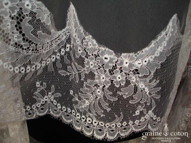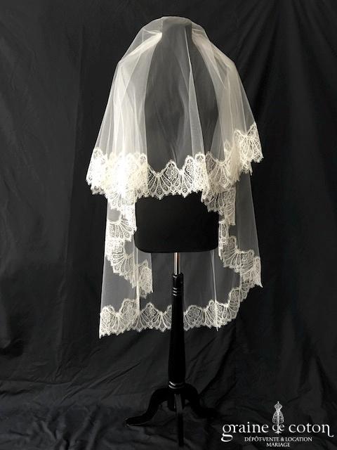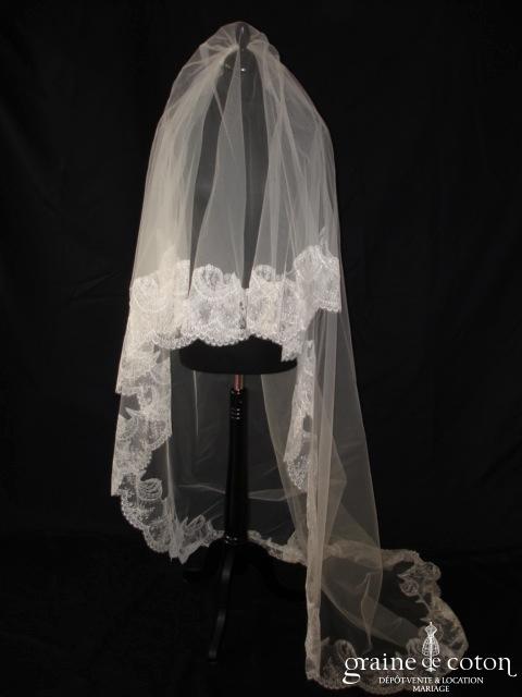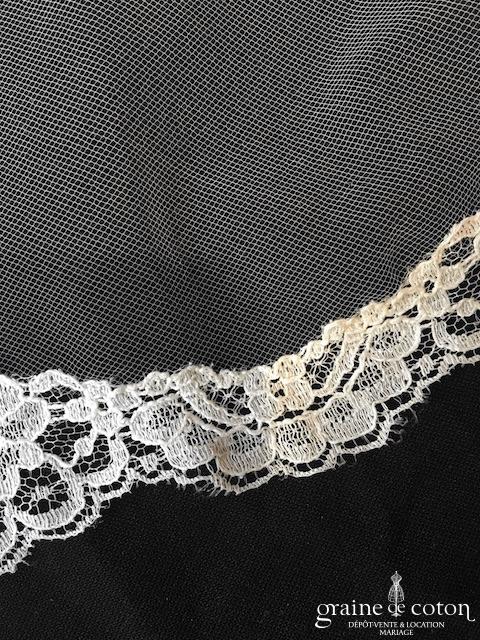 Voile long en tulle ivoire clair bordé de fine dentelle de Chantilly. Non monté sur peigne, à fixer avec des pics à chignon.