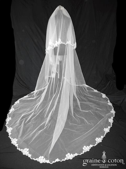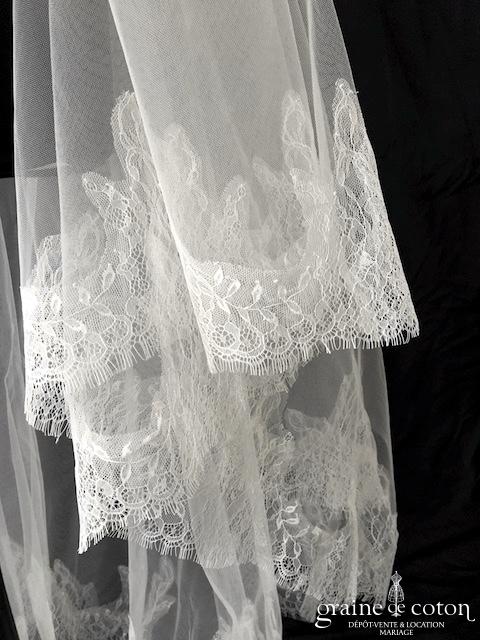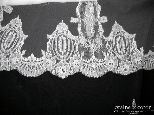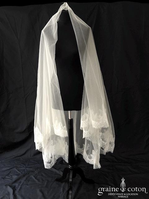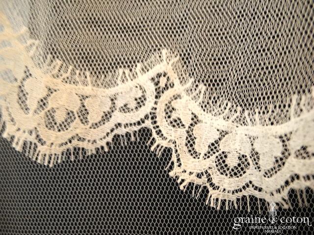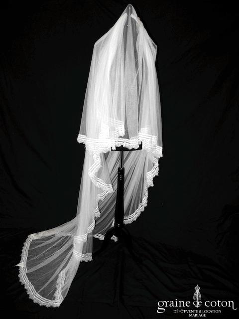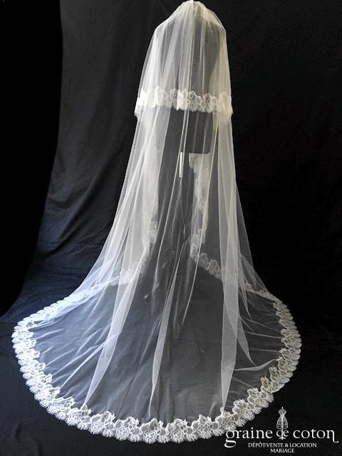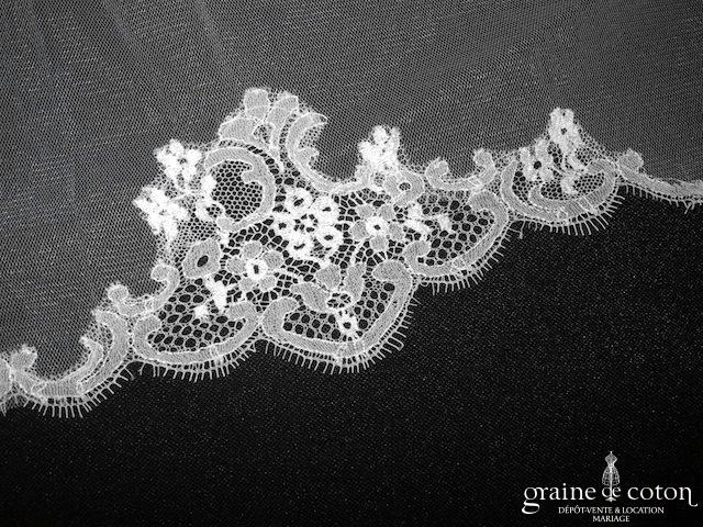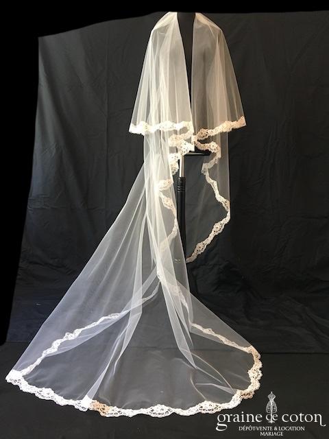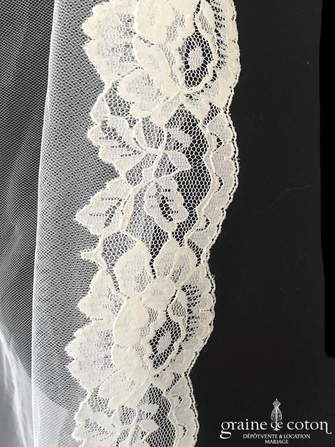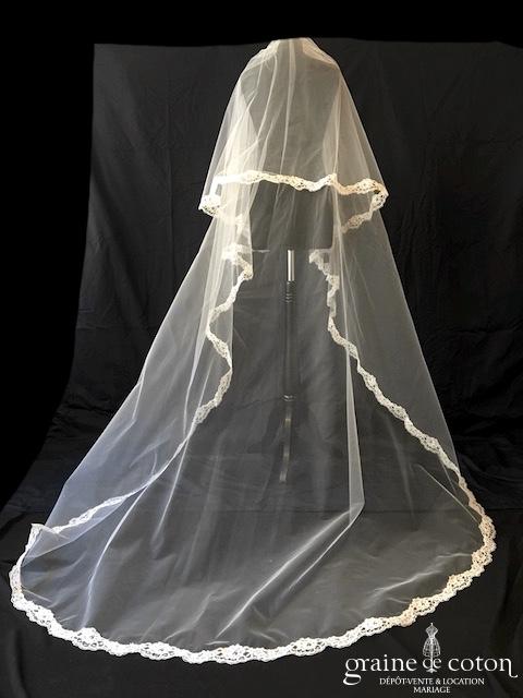 Voile long de 2 mètres en tulle ivoire clair bordé de fine dentelle de Chantilly