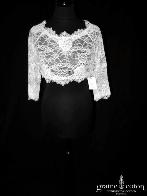 Boléro en fine dentelle de Chantilly ivoire à manches courtes et encolure bateau. Raffiné et délicat.
