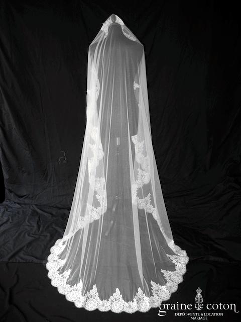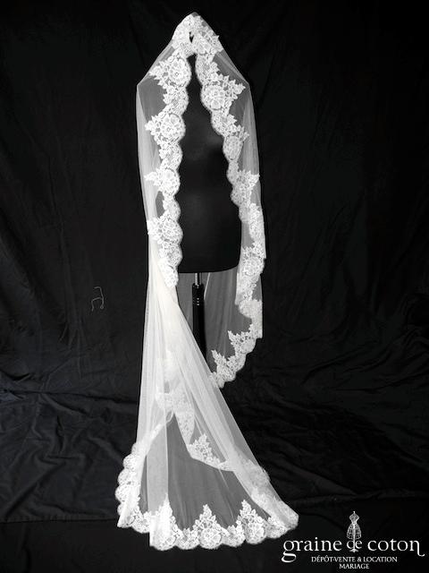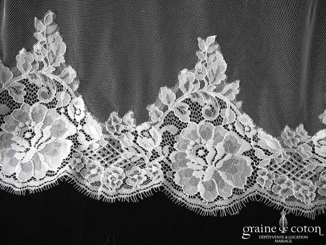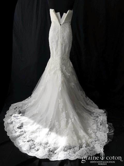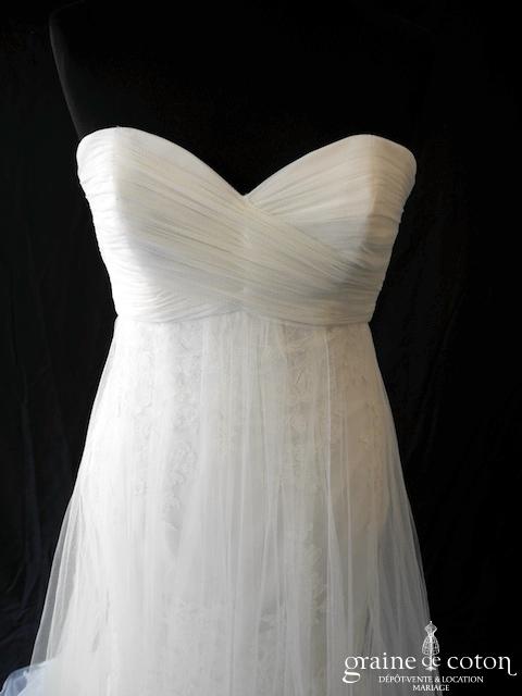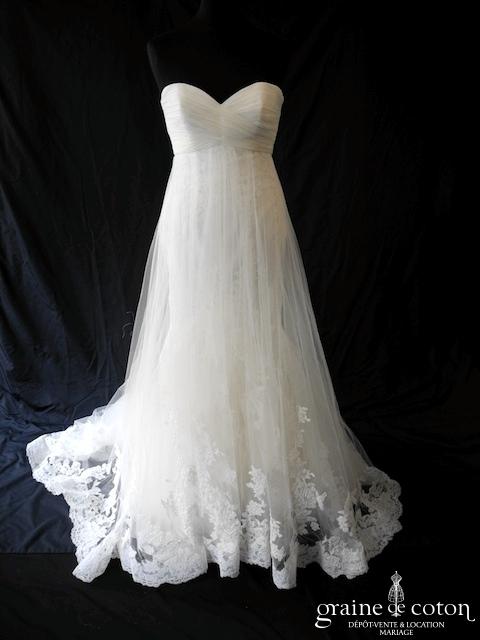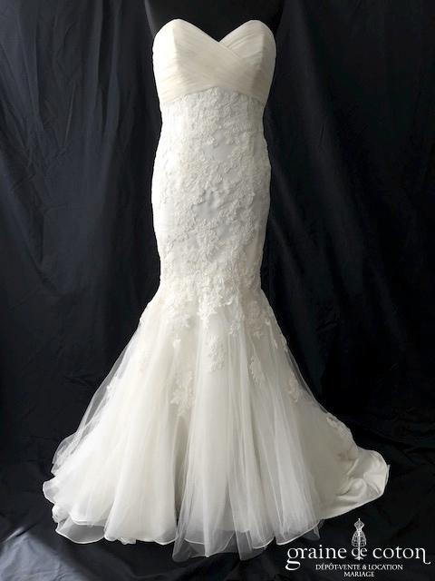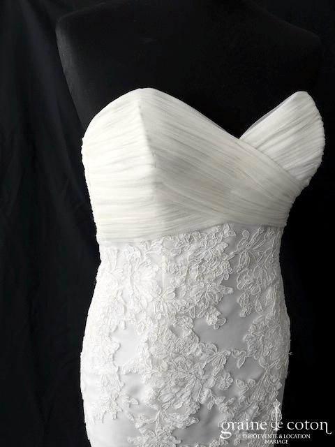 Dépôt de la somptueuse robe « Finisterre » de Pronovias, empire en tulle plissé et dentelle de Calais, forme sirène. Taille 36-38, référence 3896. Voile assorti disponible sous la référence 3897.