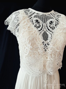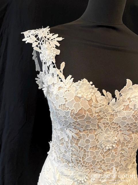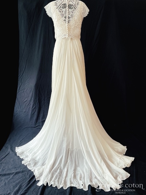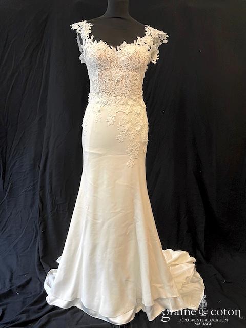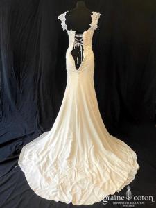 Robe une pièce ivoire clair : top en guipure avec bretelles tombantes sur les épaules. Jupe sirène en crêpe de soie épurée, petite traîne. Matières exceptionnelles, seyante et lumineuse