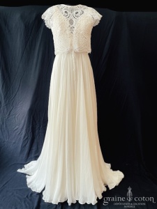 Ensemble trois pièces ivoire clair. Top décolleté en V à recouvrir d’un boléro en dentelle à manches courtes. Jupe taille haute en mousseline de soie fluide, traîne. Délicate, chic et …