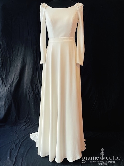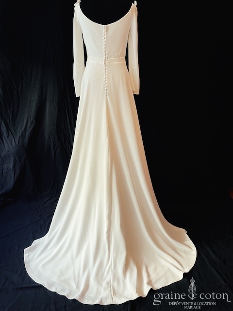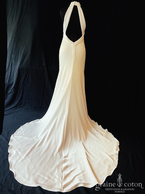 Robe une pièce ivoire clair : top en guipure avec bretelles, dos nu en V. Jupe taille haute soulignée d’une ceinture, en mousseline fluide légèrement évasée avec petite traîne. Légère, …