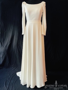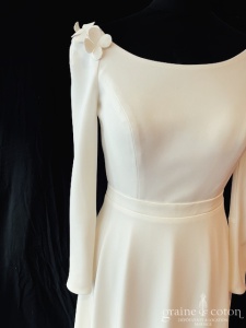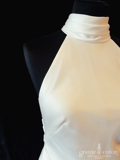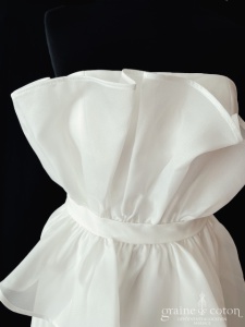 Robe une pièce en tulle ivoire : bustier coeur drapé, dos boutonné. Ceinture de strass amovible. Jupe taille haute tout en tulle fluide avec traîne. Pure et élégante.