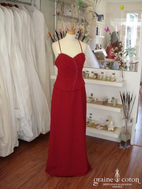 Robe courte, dos nu, rouge foncé. Matière voilée fluide, ceinture en satin assortie. Jupe « volante », idéale pour les soirées dansantes !